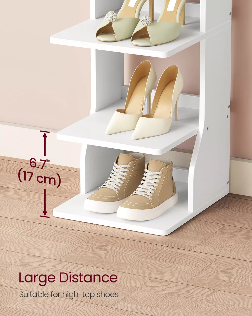 • Sokoldalú tárolás: A 9 polc akár 18 pár cipő befogadására alkalmas, a polcok közötti 17 cm-es távolság pedig lehetővé teszi magasabb szárú cipők, bakancsok és csizmák tárolását is