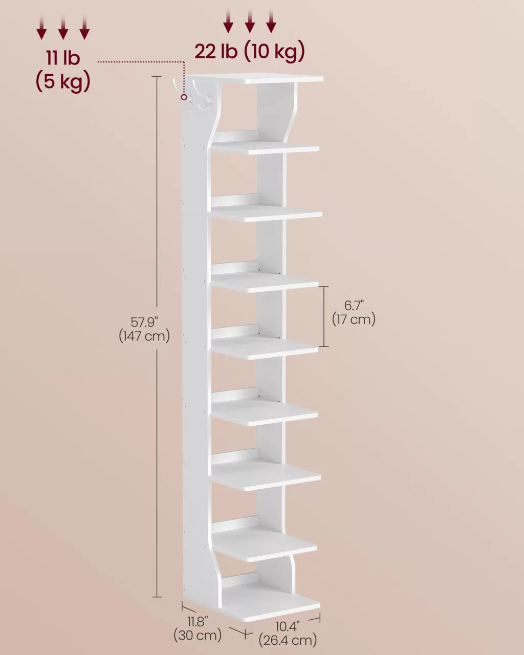 VASAGLE 9 szintes keskeny cipőtartó állvány matt fehér akasztókkal