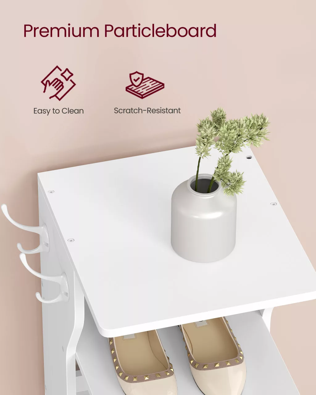 • Extra akasztók a praktikusságért: Az oldalsó akasztók ideálisak kulcsok, táskák vagy esernyők tárolására, így reggel minden kéznél van, amikor sietős az indulás