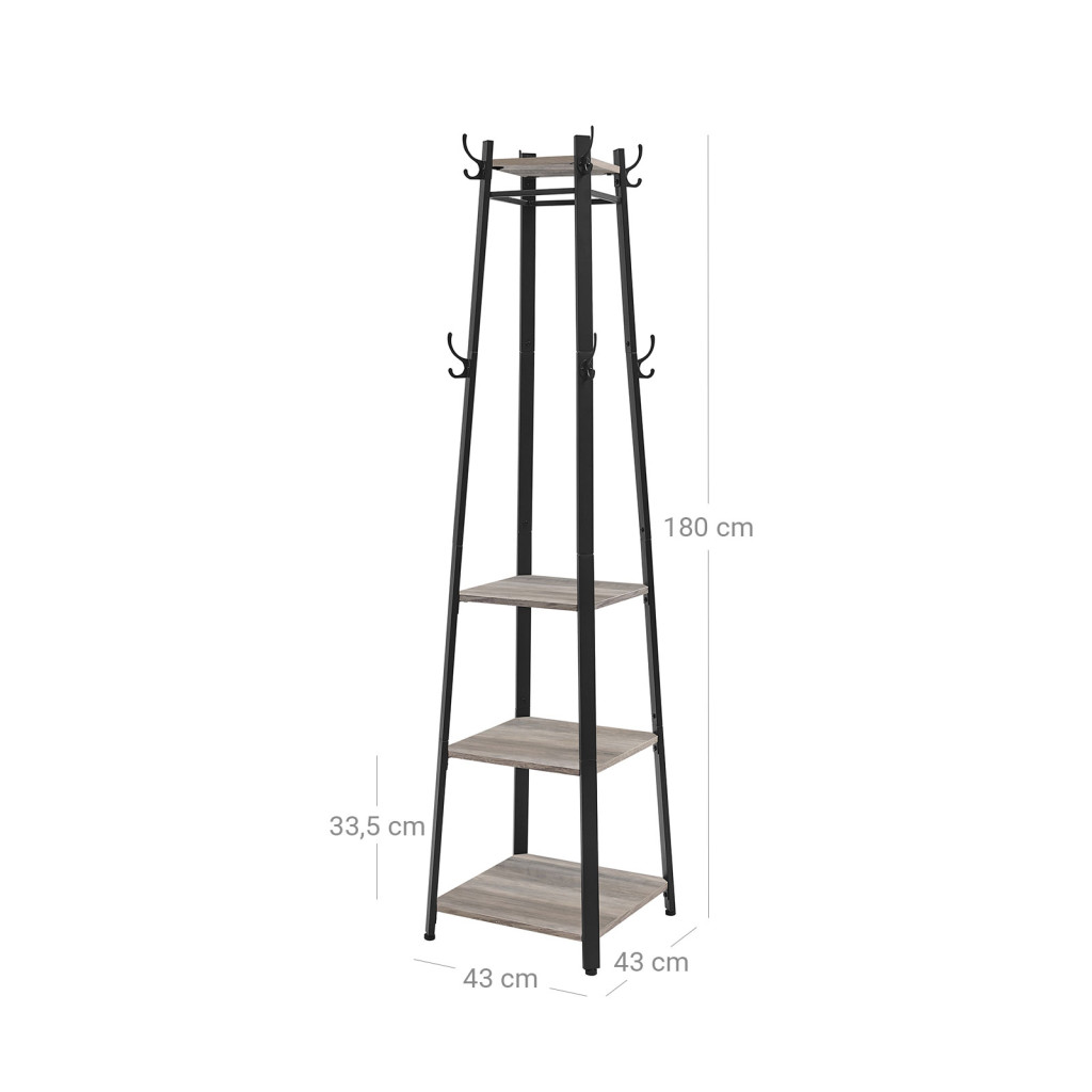 Multifunkcionális állófogas 8 akasztóval és 3 polccal, amely ötvözi az ipari dizájnt a praktikus tárolással. Tökéletes megoldás kabátok, táskák és kiegészítők rendezett tárolására.