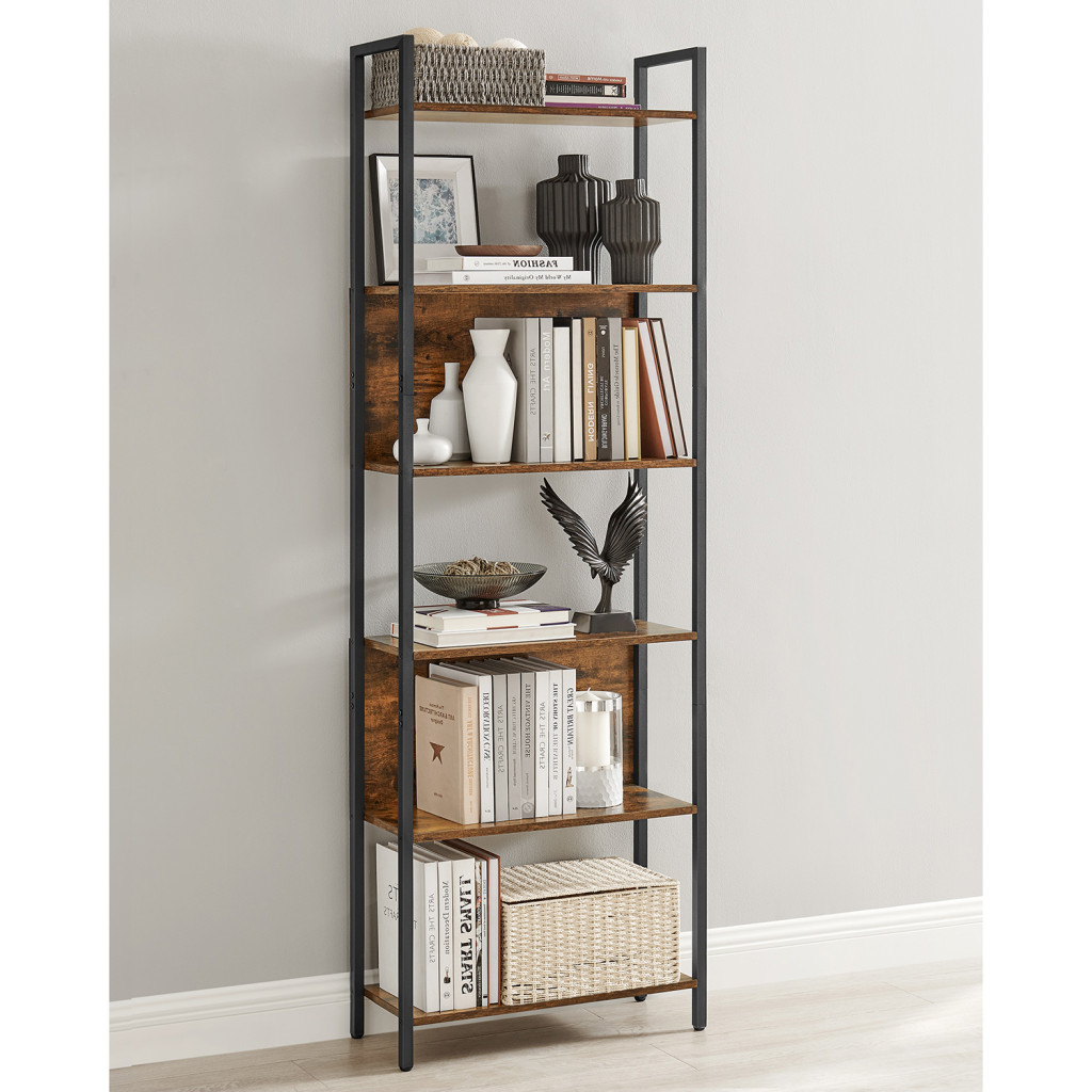Modern ipari stílusú, 6 polcos könyvespolc acél vázzal és rusztikus barna polcokkal, amely tökéletes megoldást nyújt könyvek és dekorációs tárgyak tárolására.