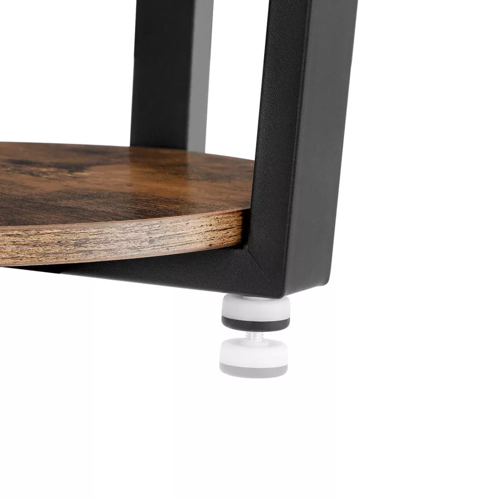 Kétszintes, ipari stílusú kisasztal rusztikus barna asztallappal és fekete acél vázzal, amely tökéletesen ötvözi a funkcionalitást és a stílusos megjelenést.