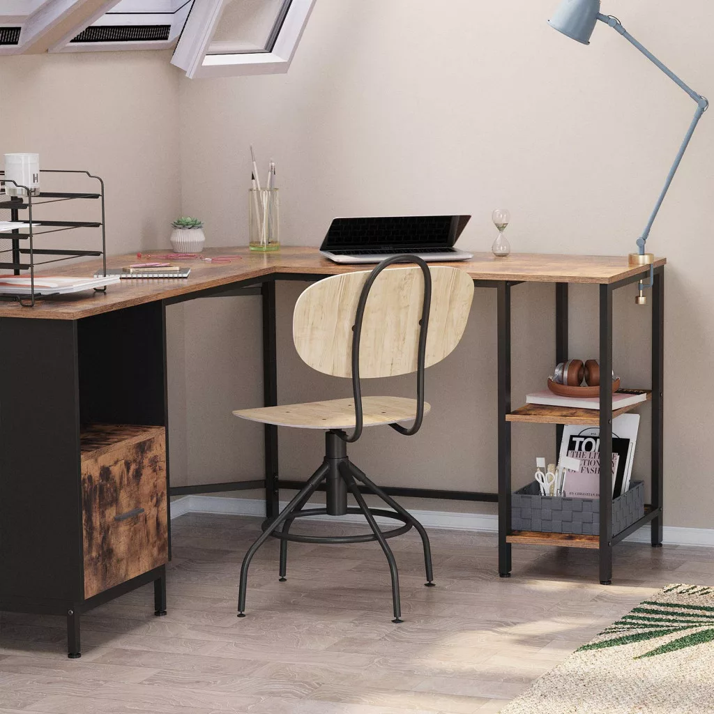 Modern, ipari stílusú L-alakú sarokíróasztal beépített tárolóval és polcokkal, amely tökéletes megoldást nyújt az otthoni irodába vagy dolgozószobába.