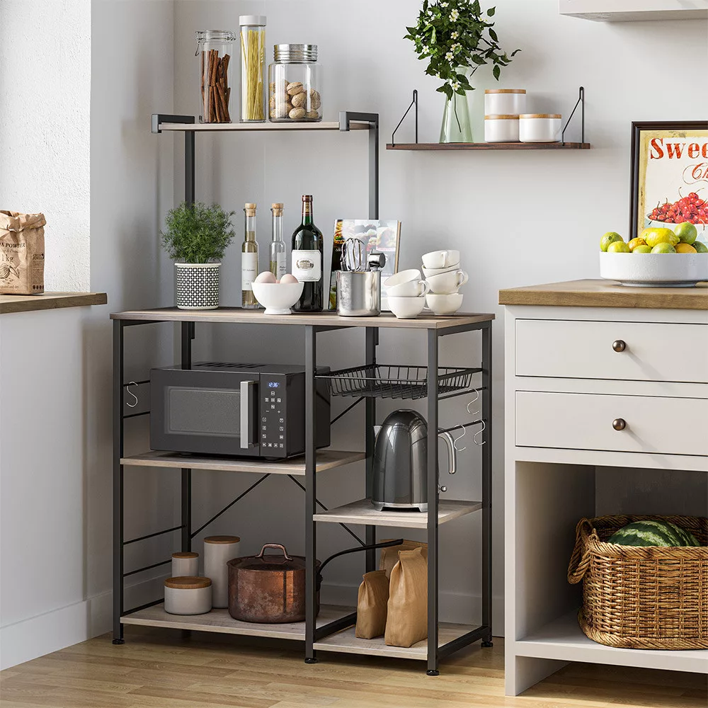 Sokoldalú konyhai állvány mikrohullámú sütőhöz és tároláshoz, 6 praktikus S-kampóval és drótkosárral, modern szürke-bézs és fekete kivitelben.