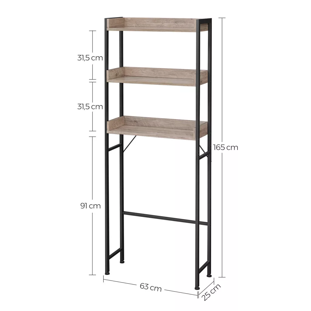 Stílusos és praktikus fürdőszobai állvány 3 nyitott polccal, amely tökéletesen illeszkedik a WC vagy mosógép fölé, maximalizálva a tárolóhelyet industrial dizájnnal.