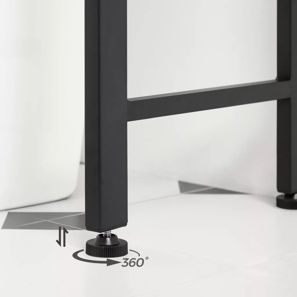 Ez a sokoldalú fürdőszobai állvány tökéletes megoldást nyújt a WC feletti kihasználatlan tér hasznosítására. A vintage hatású szürke polcok és a fekete fémváz harmonikus kombinációja modern industrial megjelenést kölcsönöz fürdőszobájának. A három tágas polc ideális törölközők, tisztálkodási szerek és dekorációs elemek tárolására.