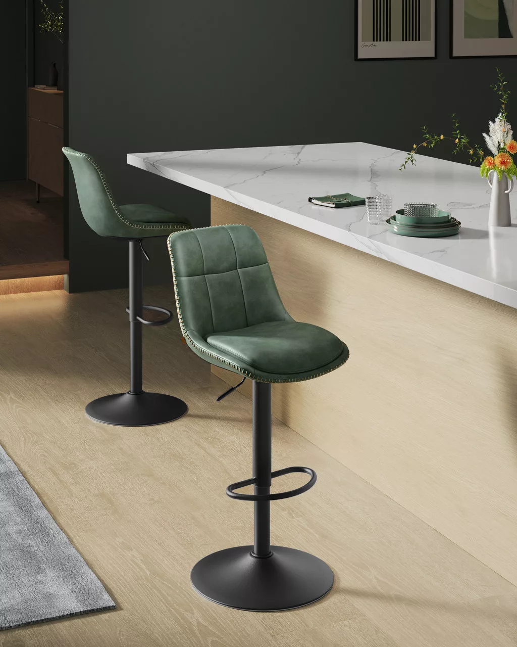 Elegáns, erdőzöld bárszék páros állítható magassággal és 360 fokos forgási lehetőséggel, amely tökéletes választás konyhaszigetek és bárok mellé.