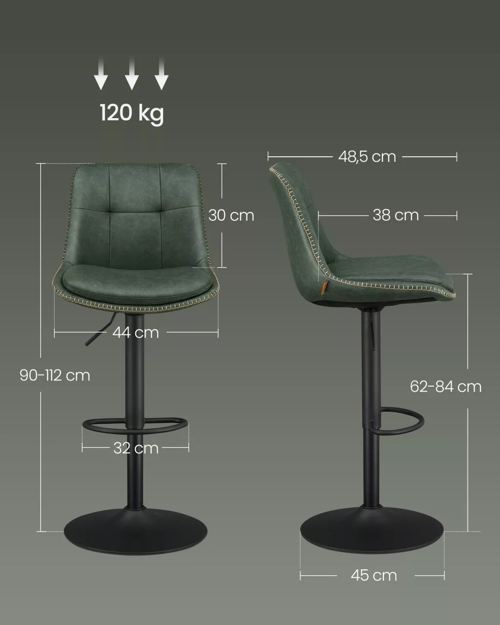 A VASAGLE bárszék kollekció ötvözi a modern dizájnt a funkcionalitással. A steppelt kárpitozású, erdőzöld PU bőr borítás és a fekete acél váz elegáns megjelenést kölcsönöz, miközben tökéletesen illeszkedik bármilyen enteriőrbe. A párnázott ülőfelület és háttámla maximális kényelmet biztosít hosszabb használat esetén is.