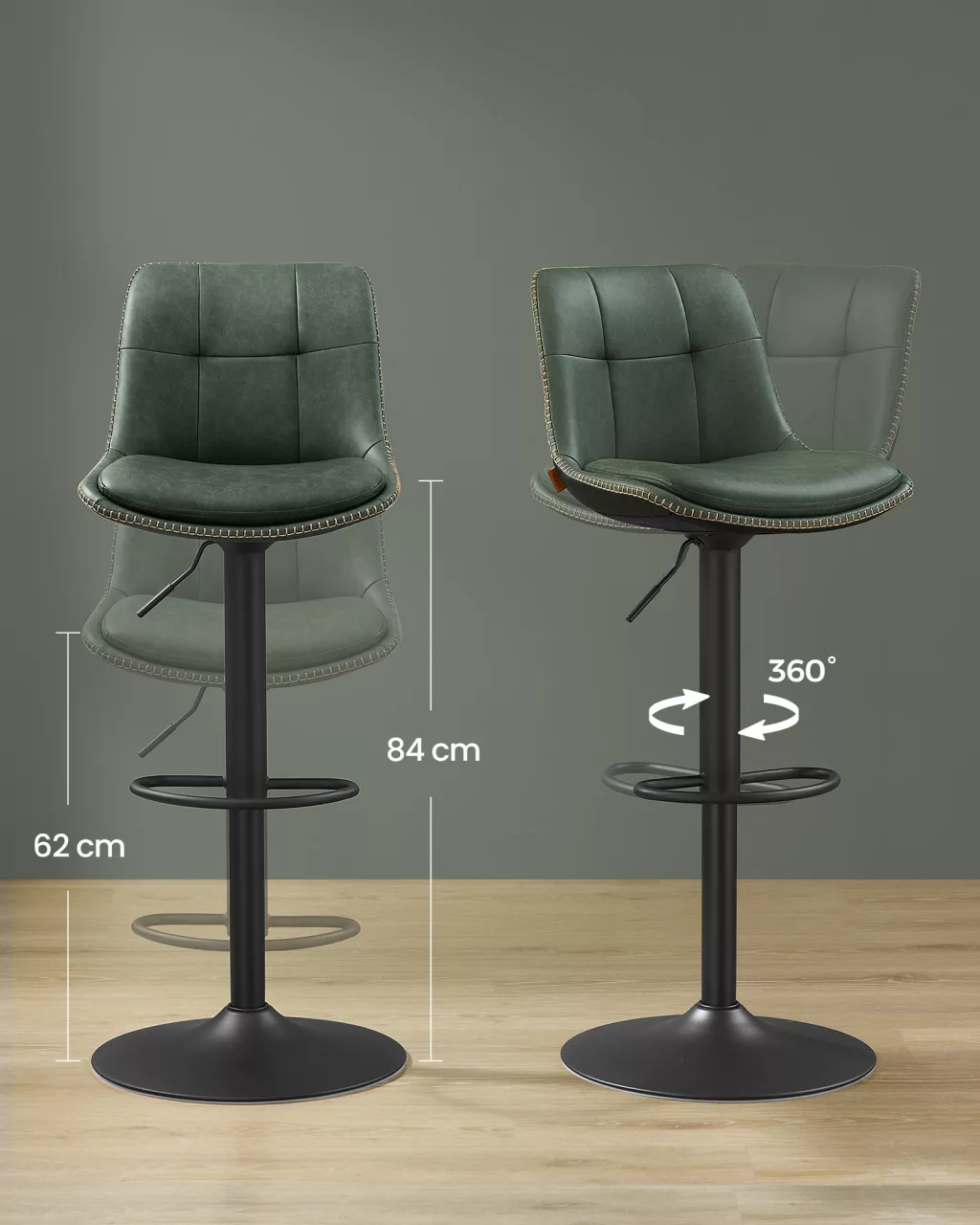 VASAGLE Állítható Magasságú Bárszék Szett Erdőzöld PU Bőr Párnázott Háttámlával