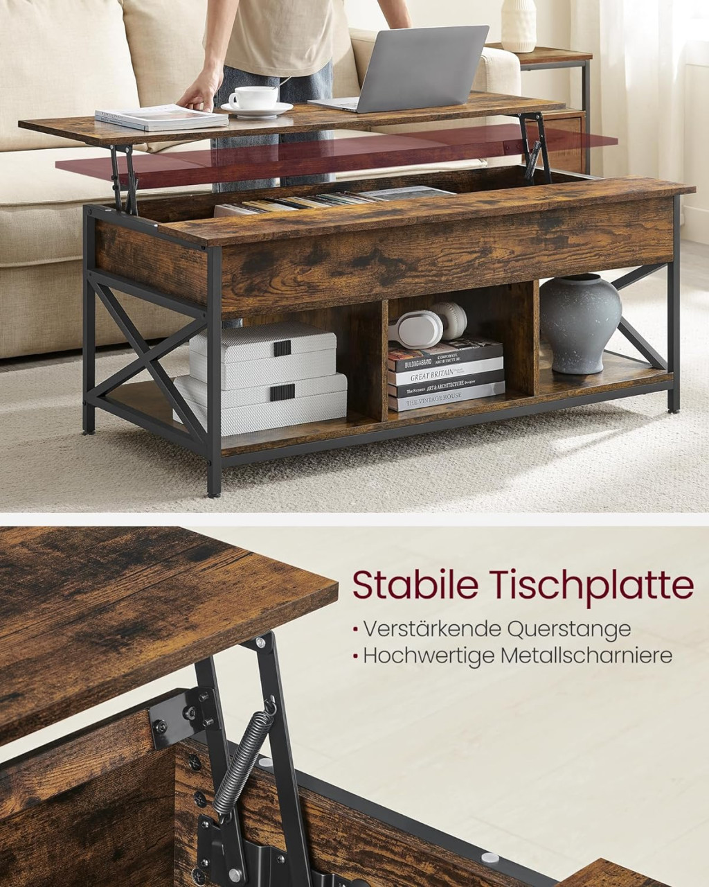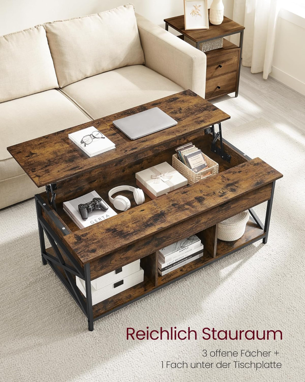 Sokoldalú dohányzóasztal állítható magasságú lappal, rejtett és nyitott tárolóterekkel, vintage barna felülettel és fekete acél vázszerkezettel.