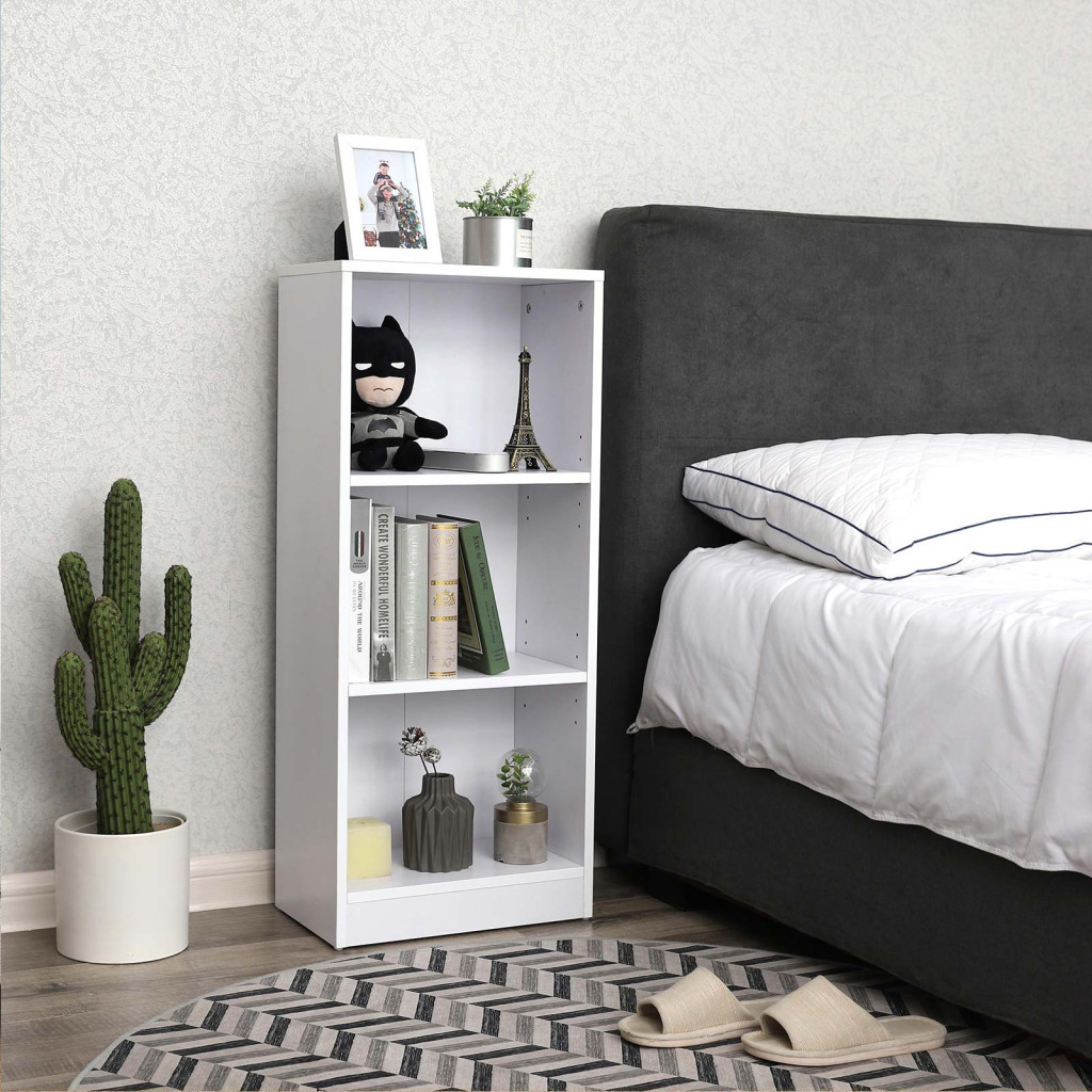 Kompakt és sokoldalú 3 szintes könyvespolc állítható polcmagassággal, ideális könyvek és dekorációs tárgyak tárolására otthoni vagy irodai környezetben.
