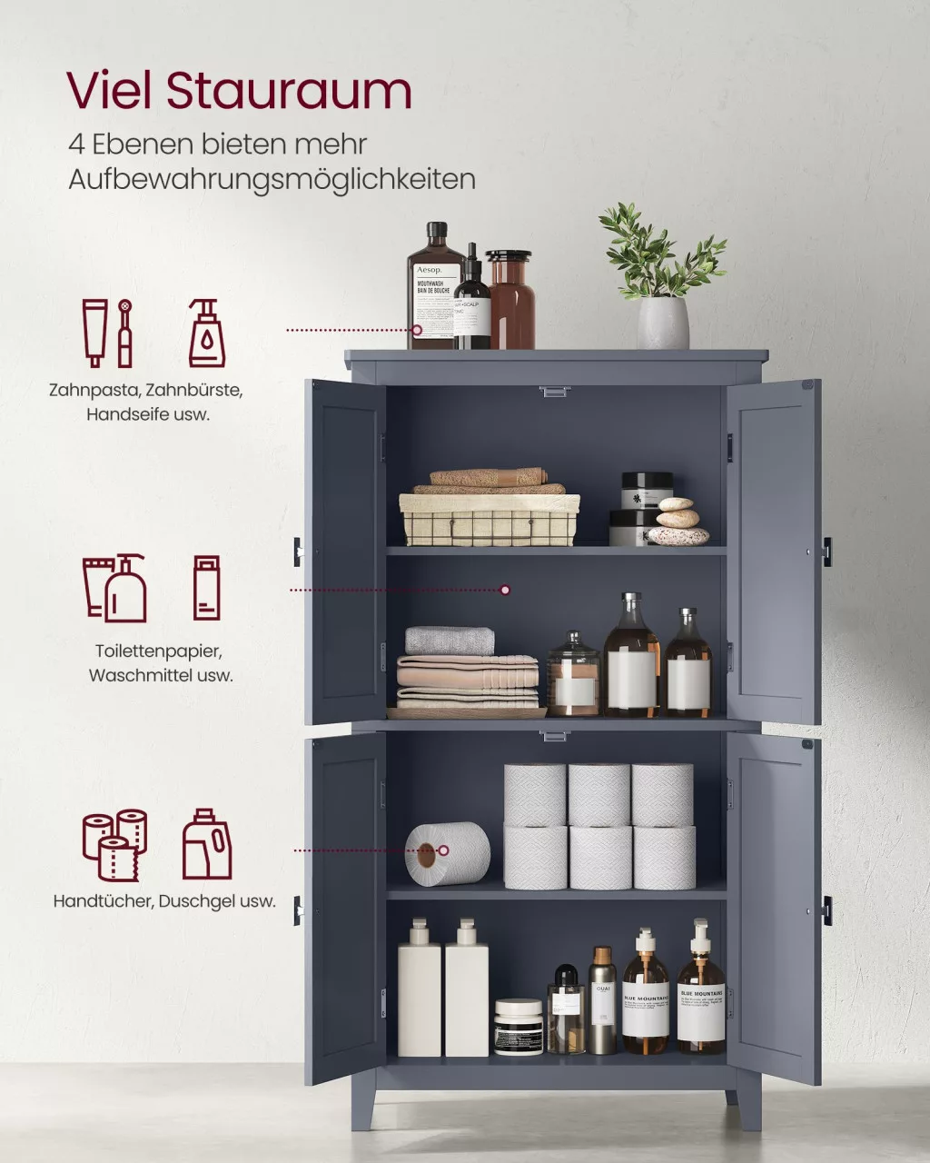 VASAGLE BBC552G01 Fürdőszobai Tároló Szekrény MDF palaszürke 4 ajtós