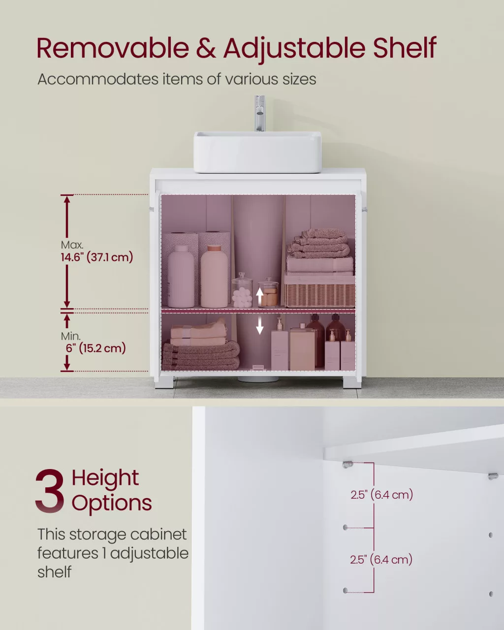 • Állítható polcrendszer: A három magassági beállítás lehetővé teszi, hogy személyre szabja a tárolóhelyet, így minden fürdőszobai kellék számára megtalálja a megfelelő helyet