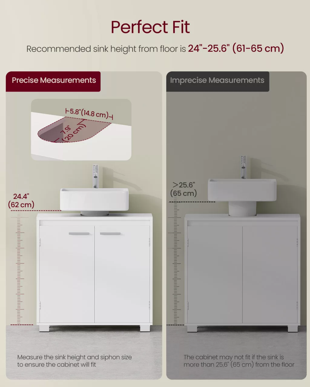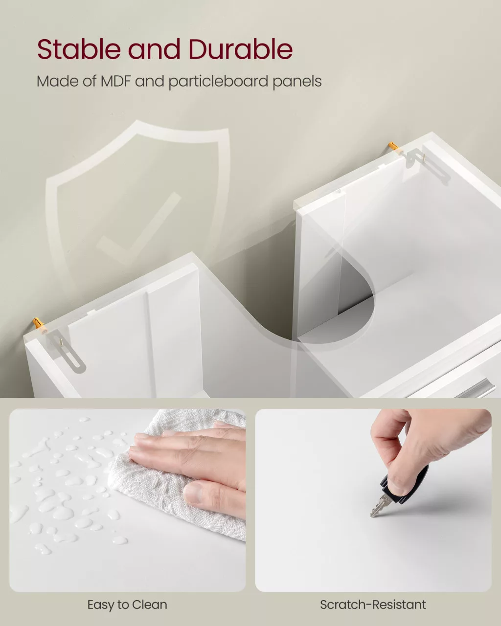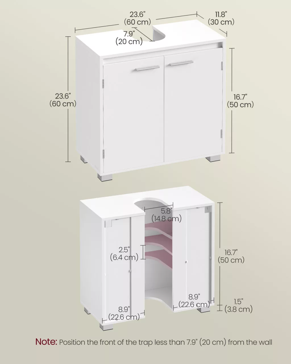 • Szifon-barát kialakítás: A hátsó oldalon kialakított nyílás biztosítja, hogy a szekrény tökéletesen illeszkedjen a meglévő vízvezeték rendszerhez anélkül, hogy átalakításra lenne szükség