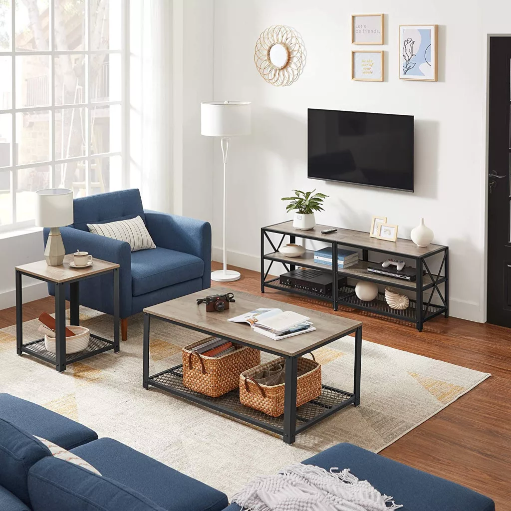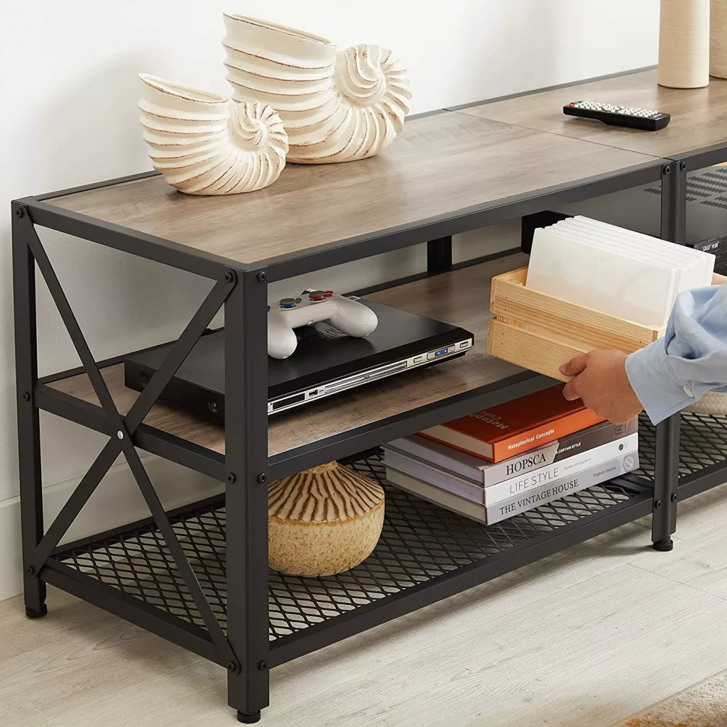 A három szintes kialakítás bőséges helyet kínál a szórakoztató elektronikai eszközök, játékkonzolok és dekorációs tárgyak elrendezéséhez. Az alsó rácsos polc extra tárolóhelyet biztosít, miközben a légáteresztő kialakítás megakadályozza a por lerakódását.