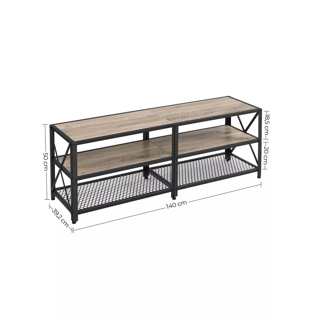 Ez az ipari stílusú TV állvány tökéletes kombinációja a praktikusságnak és a modern dizájnnak. A robusztus acélváz és a greige színű polcok harmonikus egységet alkotnak, miközben maximális stabilitást biztosítanak akár 65 colos TV-készülékek számára is.