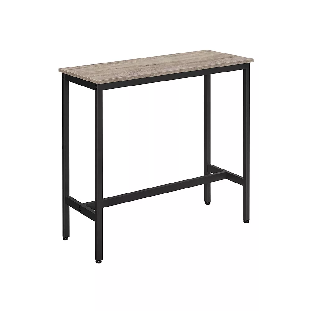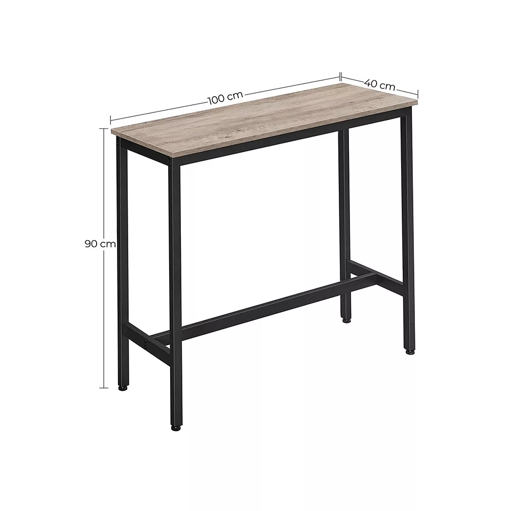 A VASAGLE bárasztal tökéletes választás azok számára, akik kis alapterületen szeretnének stílusos és funkcionális étkezőhelyet kialakítani. A 100 x 40 x 90 cm-es méretű asztal keskeny, mindössze 40 cm mély kialakításának köszönhetően még a legszűkebb konyhákban és étkezőkben is elfér, miközben elegendő helyet biztosít tányéroknak, poharaknak és evőeszközöknek. Az ipari stílusú dizájn greige színű forgácslap asztallapot és karcsú, 25 x 25 mm vastag fekete acél lábakat kombinál, amely modern és időtlen megjelenést kölcsönöz bármely térnek.