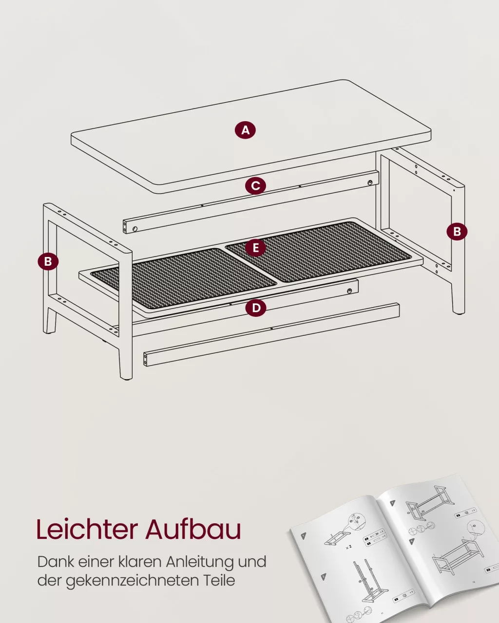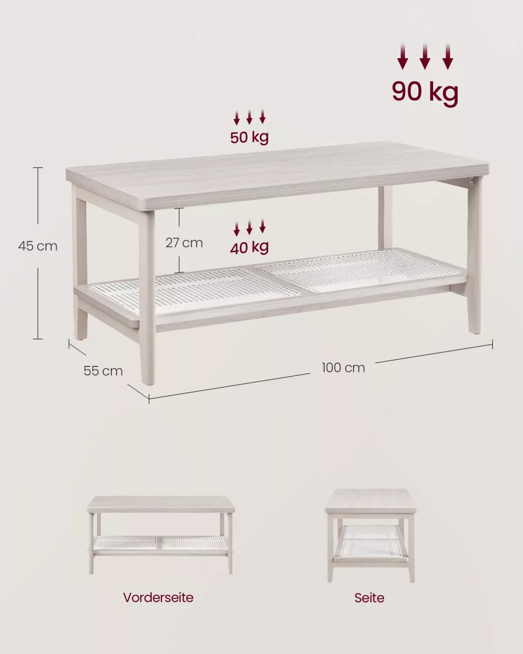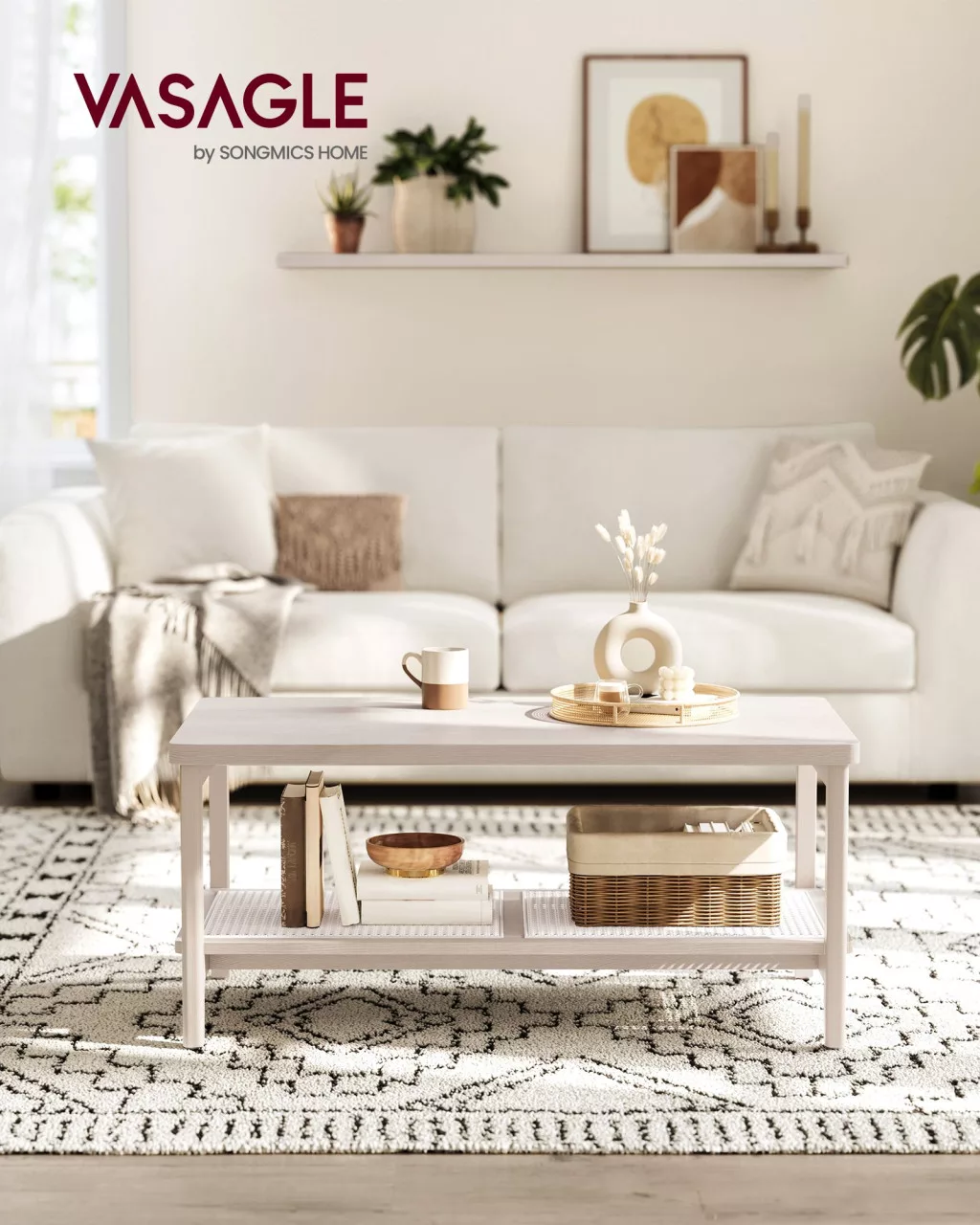 Ez a VASAGLE dohányzóasztal a modern boho stílus és praktikum tökéletes találkozása. A zabpehely bézs színű MDF asztallap és a PVC rattan polc harmonikus összhangot teremt, miközben bőséges helyet biztosít a mindennapi tárgyak tárolására.