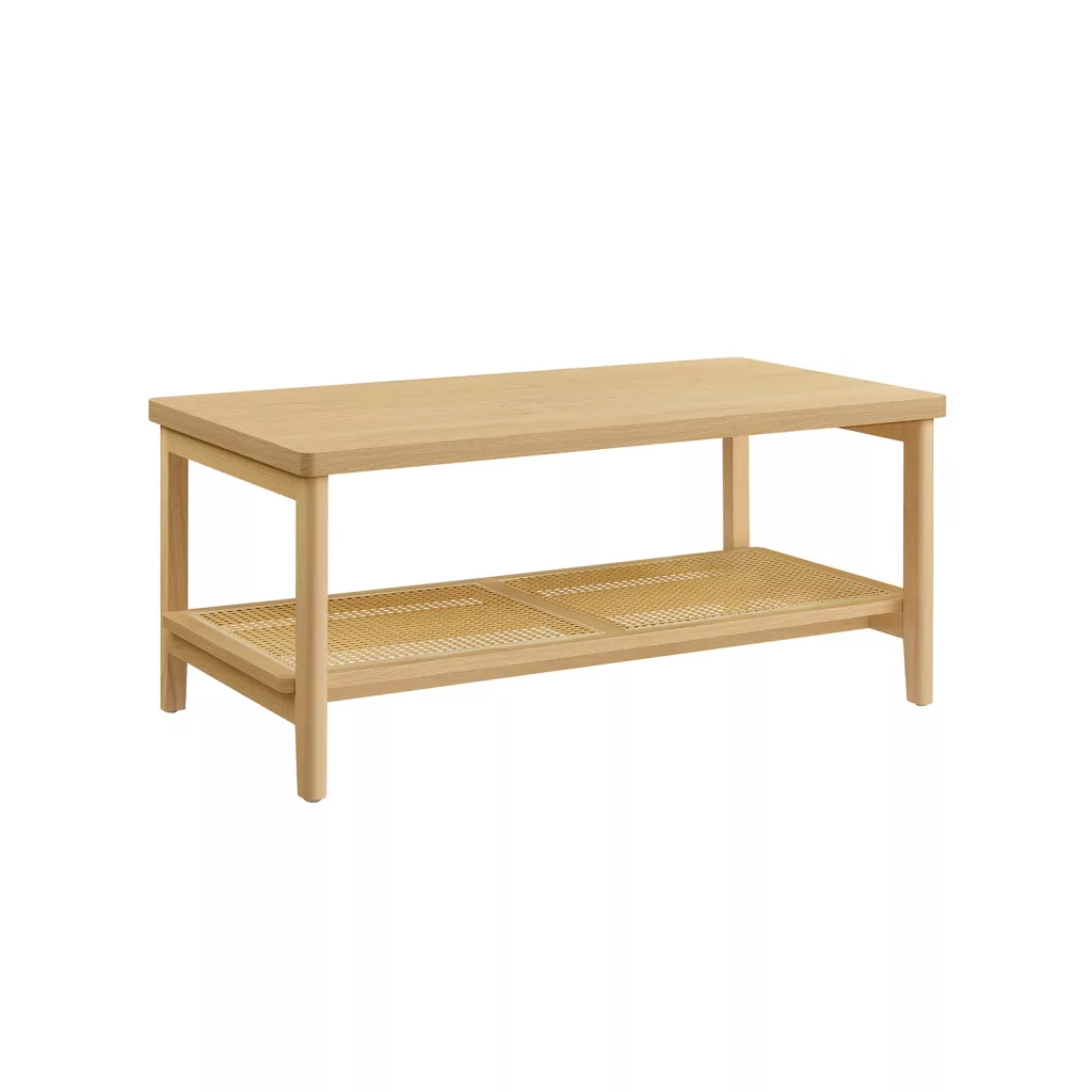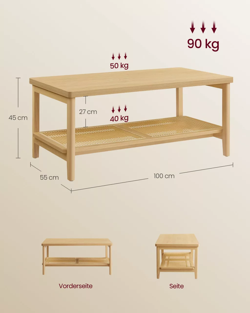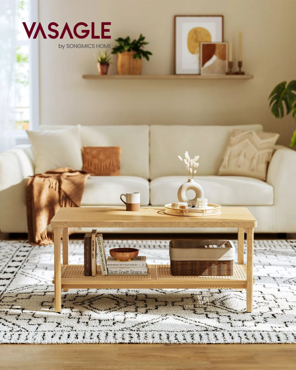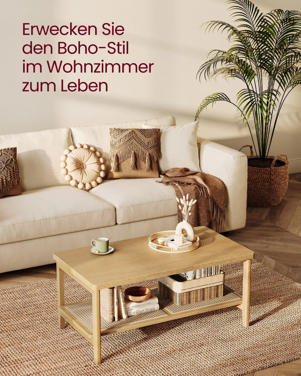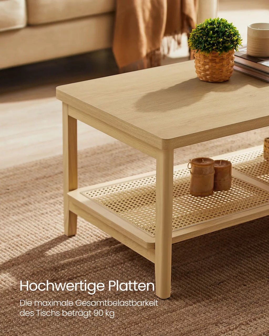 VASAGLE Boho Kétsoros Dohányzóasztal Rattán Tárolópolccal Tölgy Bézs