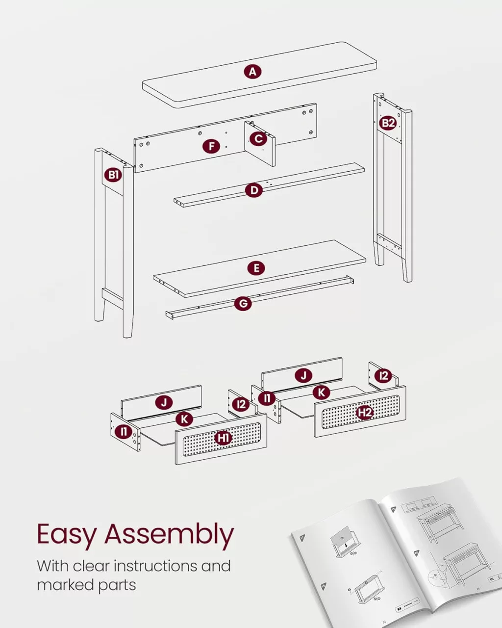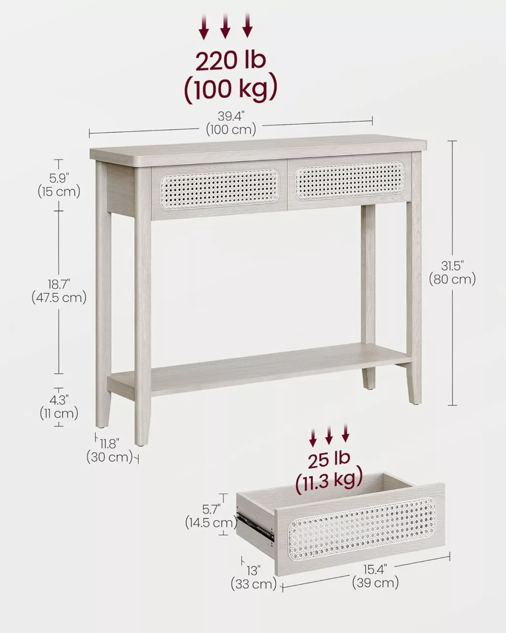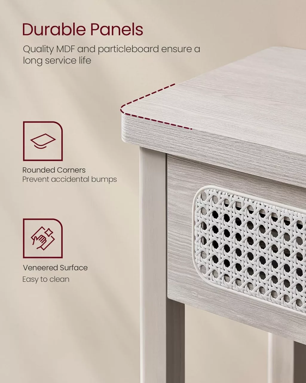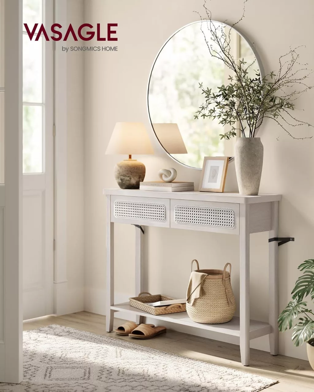 VASAGLE Boho Konzolasztal Rattan Frontos Fiókokkal Zabkása Bézs