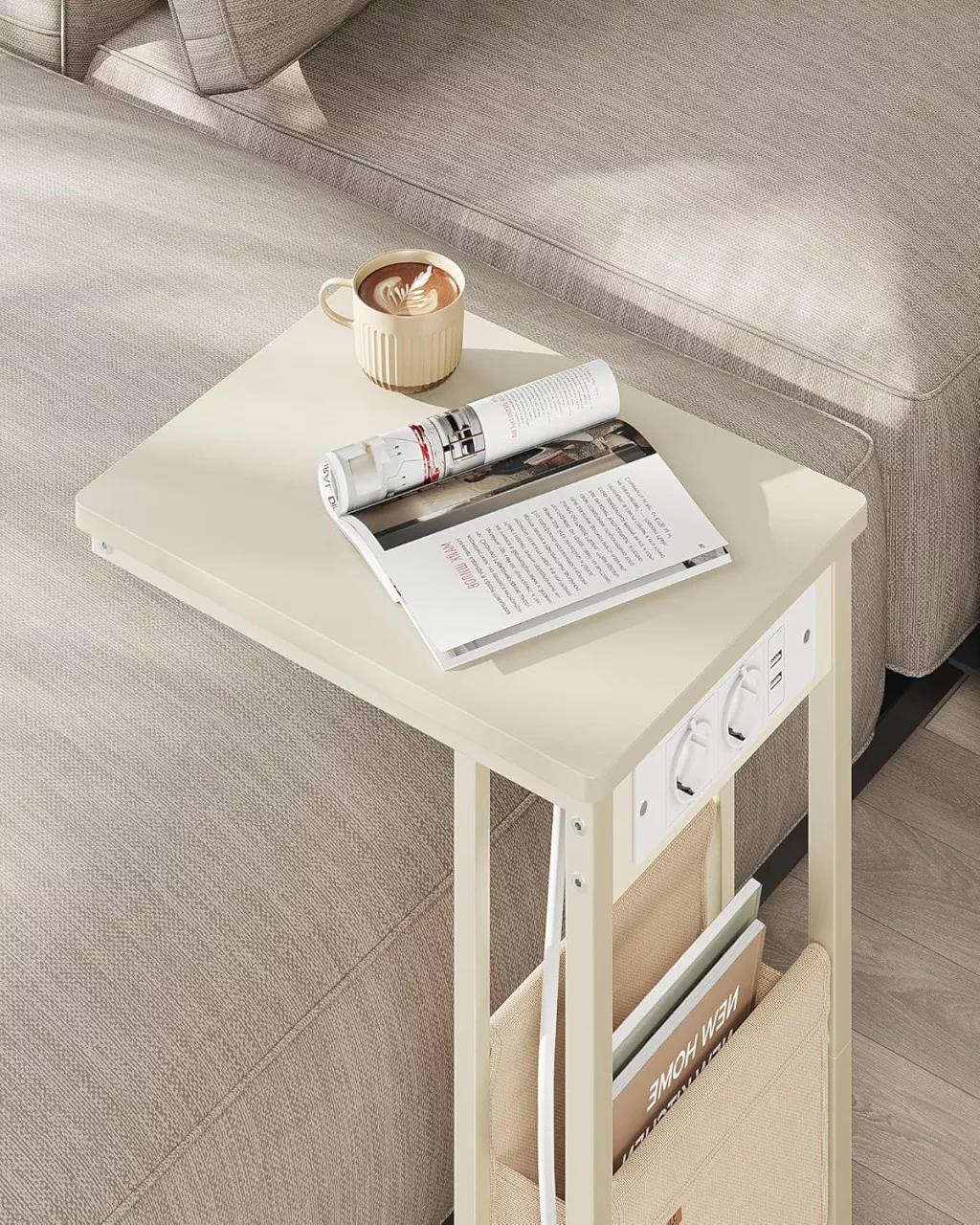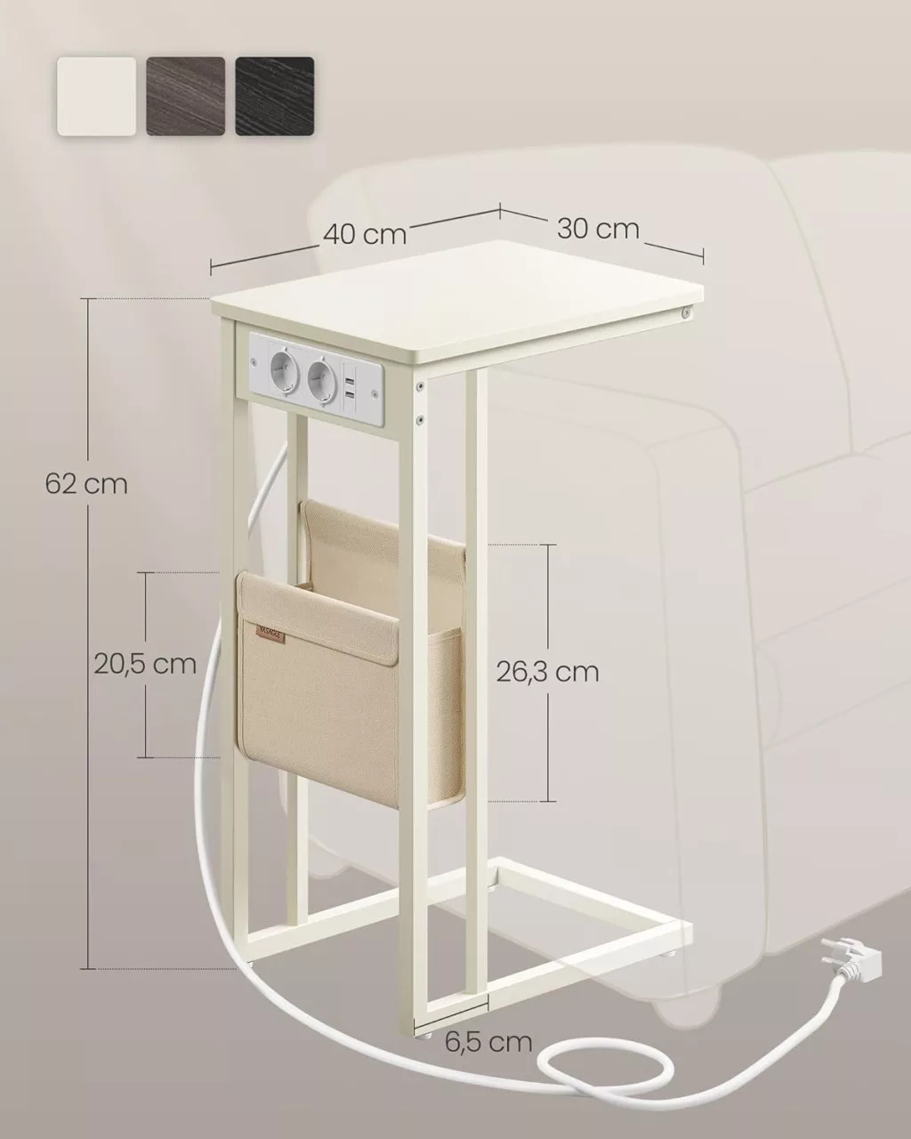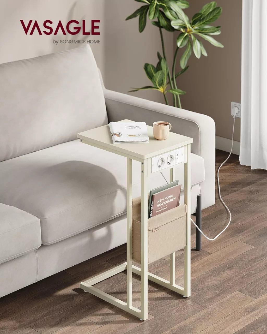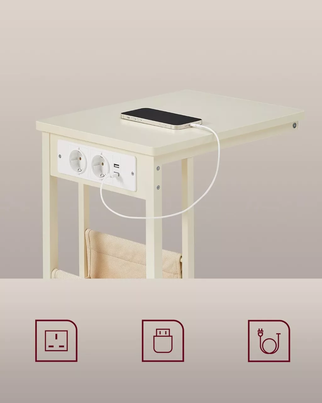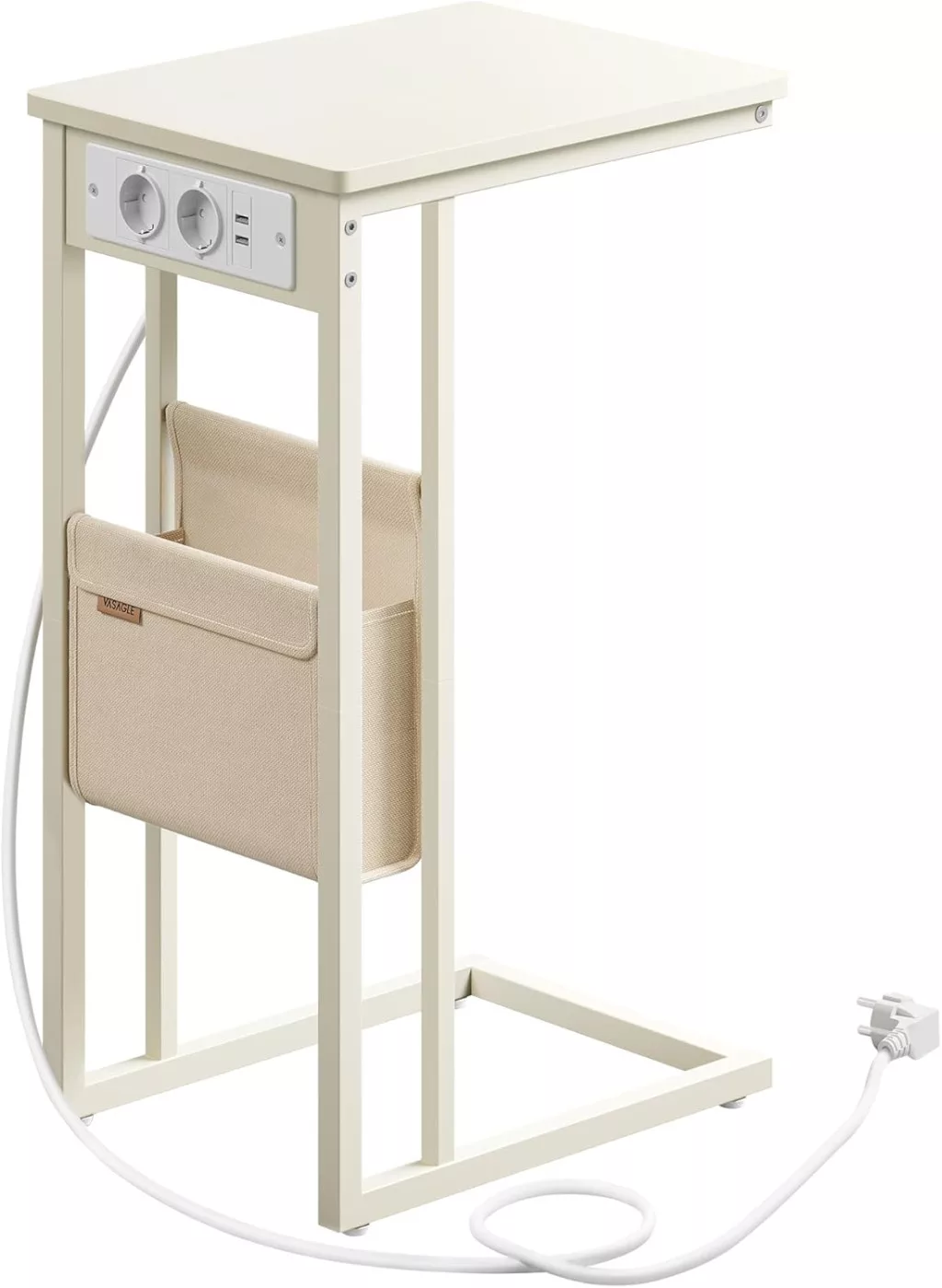 VASAGLE C-alakú Kisasztal Beépített Konnektorokkal Krémfehér