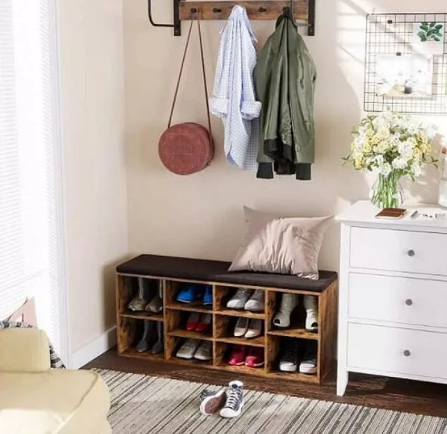 Ez a rusztikus barna cipőspad egyesíti a praktikus tárolást és a kényelmes ülőhelyet. A 10 tágas rekesz lehetővé teszi akár 10-12 pár cipő rendezett tárolását, míg a levehető, sötétszürke párnázott ülés kényelmes helyet biztosít a cipők fel- és levételéhez.