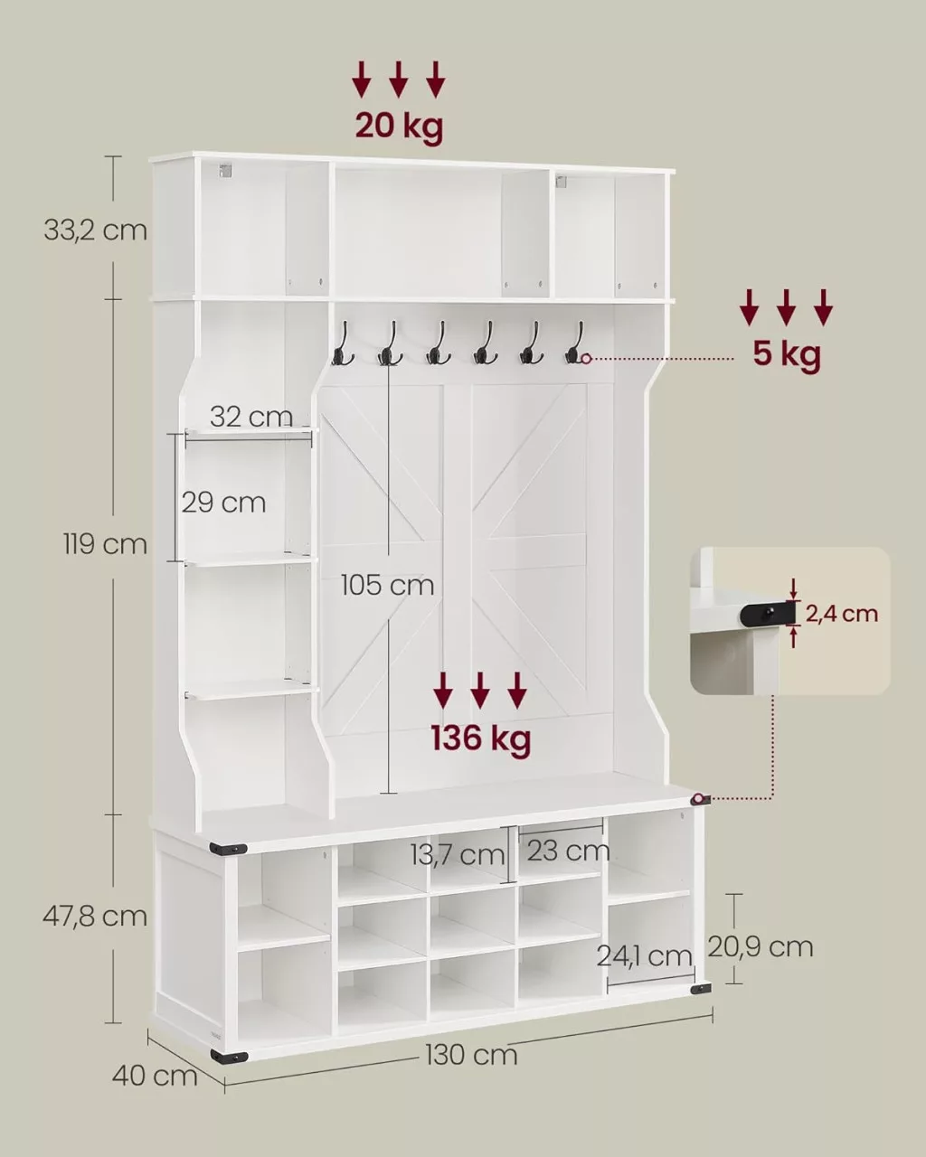 • Kompakt 4-az-1-ben dizájn: kabátakasztó, tárolópolc, ülőpad és cipőtartó egyben