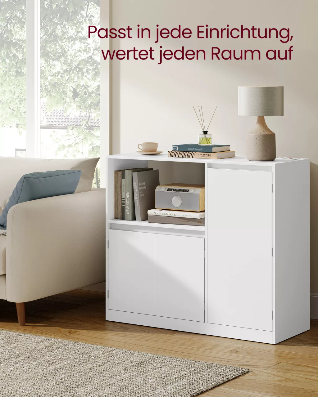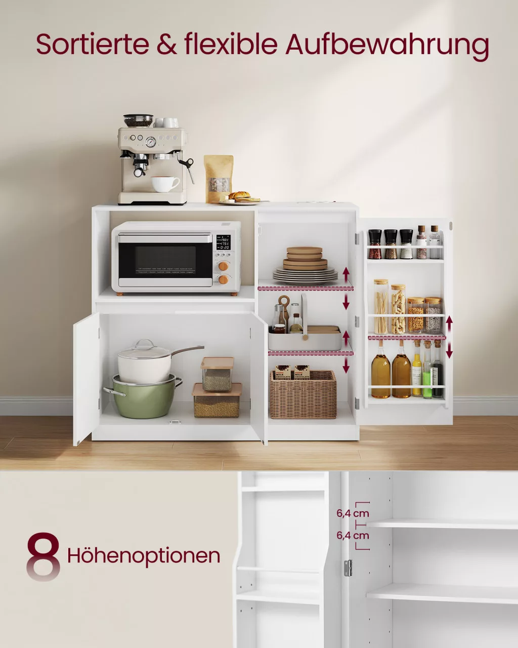 A VASAGLE Custos Collection tárolószekrénye tökéletes választás azok számára, akik modern, letisztult dizájnt és átgondolt tárolási megoldásokat keresnek konyhájukba. A felhőfehér színű szekrény tiszta vonalvezetése és nyitott rekeszei stílusos megjelenést kölcsönöznek, miközben praktikus tárolási lehetőségeket biztosítanak. A mikrohullámú sütő számára kialakított nyitott rekesz, a három ajtós polcrendszer és a belső állítható polcok garantálják, hogy minden konyhai eszköz a helyén legyen. Az integrált elosztó túlterhelés-védelmi kapcsolóval több készülék egyidejű használatát teszi lehetővé, a hátoldalon található kábelkivezető nyílás pedig rendezett kábelvezetést biztosít.