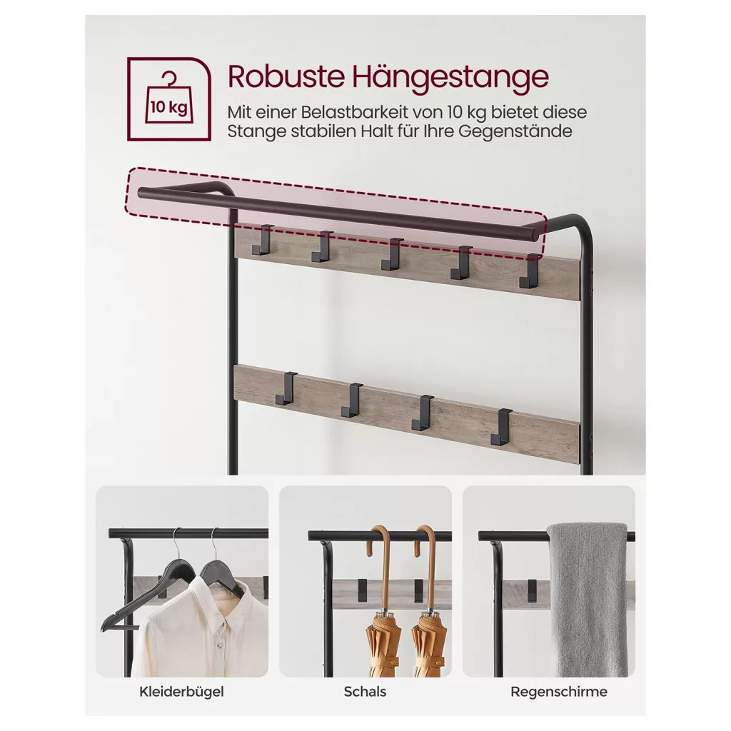 Ez az ipari stílusú előszobai állvány tökéletes megoldást nyújt a rendezett előszobához. A robusztus acélváz és a vintage hatású fahatású polcok harmonikus kombinációja nem csak szemet gyönyörködtető, de rendkívül praktikus is. A felső akasztórúd és a 9 levehető akasztó bőséges helyet biztosít a kabátoknak és kiegészítőknek.