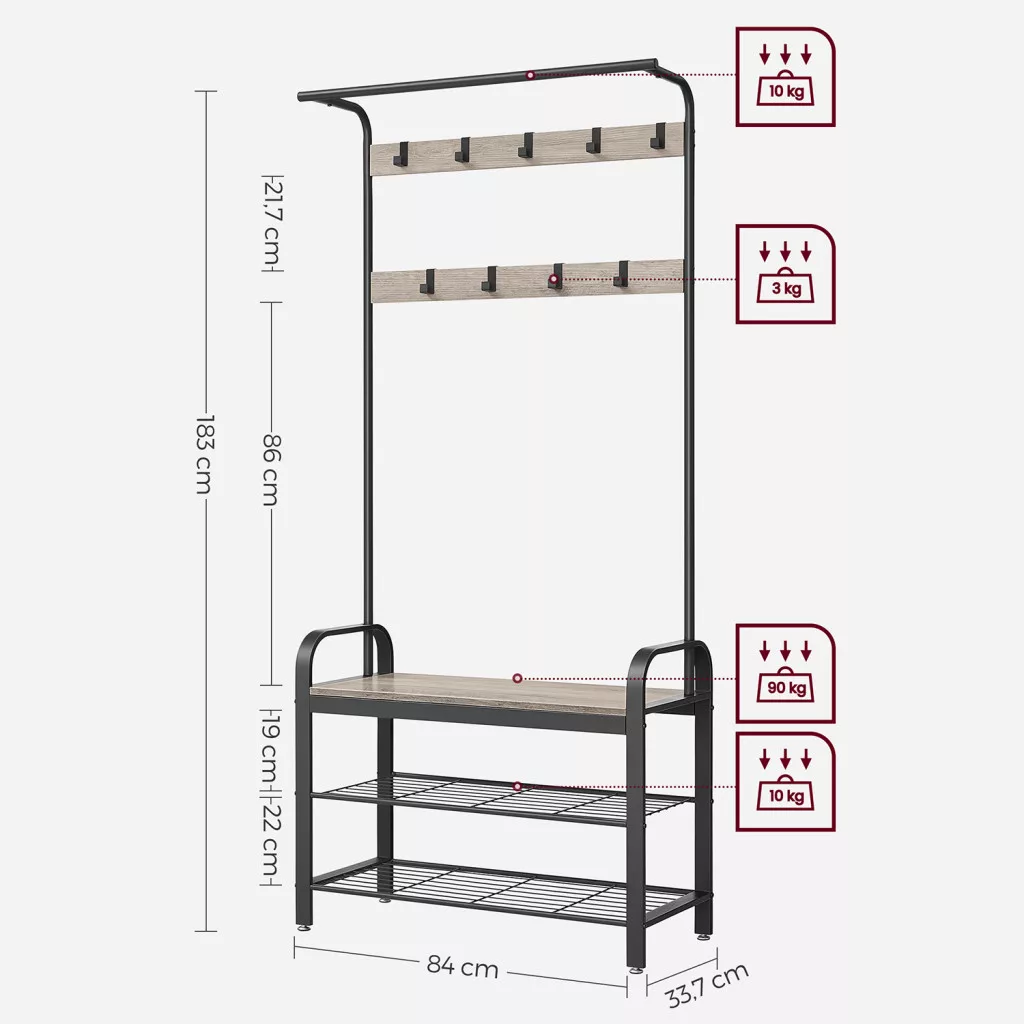Többfunkciós előszobai állvány 9 akasztóval, paddal és 2 cipőtartó polccal, amely tökéletesen ötvözi az ipari dizájnt a praktikussággal.