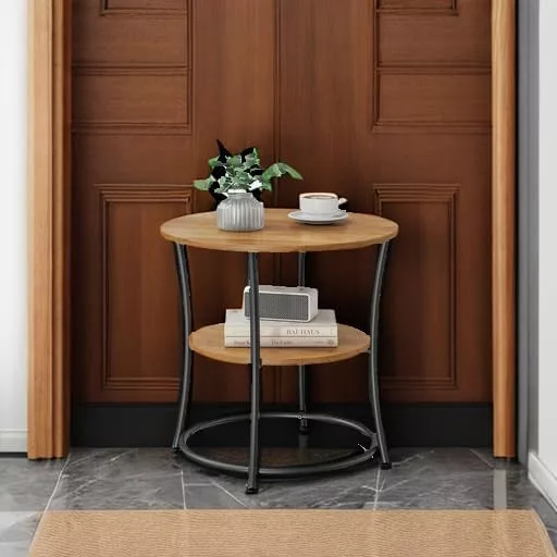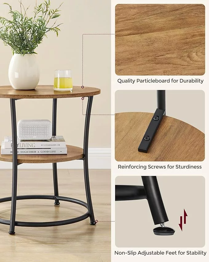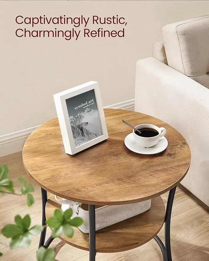 Ez a VASAGLE kisasztal tökéletesen ötvözi a rusztikus diófát a modern fekete acélvázas dizájnnal. A 55 cm átmérőjű asztallap és az alsó polc bőséges helyet biztosít dekorációk, könyvek vagy mindennapi tárgyak számára. A stabil acélváz és a megerősített lábak garantálják a tartósságot.