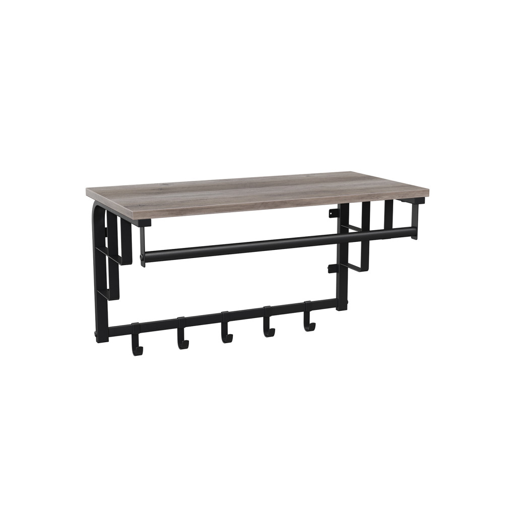 Ez a fali fogas egyesíti a praktikumot és a stílust, modern ipari megjelenésével és többfunkciós kialakításával. A szürke faborítású polc és a fekete fém váz harmonikus kombinációja tökéletesen illeszkedik bármilyen enteriőrbe. A 66 cm széles polc bőséges helyet biztosít a dekorációs tárgyaknak vagy mindennapi használati eszközöknek.