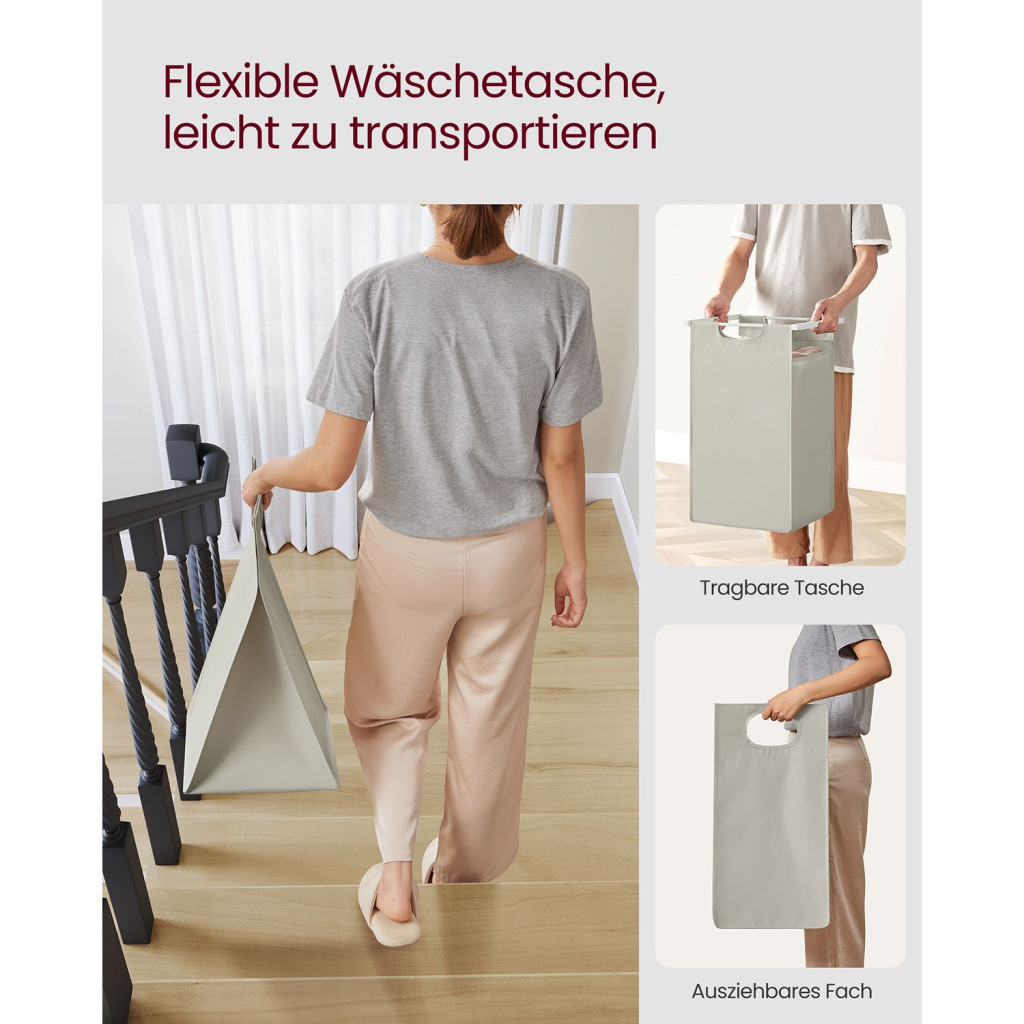 Ez a modern kialakítású szennyestartó tökéletes megoldást nyújt a ruhák rendszerezett tárolására. A két 46 literes, kivehető zsák lehetővé teszi a világos és sötét ruhák elkülönítését, míg a felső polc extra tárolóhelyet biztosít mosószerek és egyéb kellékek számára.