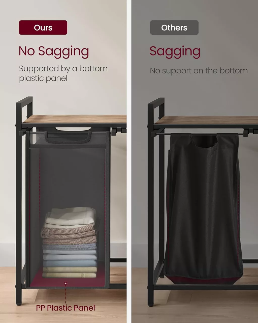A stabil acélváz és a vízlepergető Oxford szövet kombinációja tartósságot garantál. A kivehető zsákok tépőzáras rögzítéssel és műanyag aljzattal rendelkeznek, ami megkönnyíti a ruhák szállítását a mosógéphez.