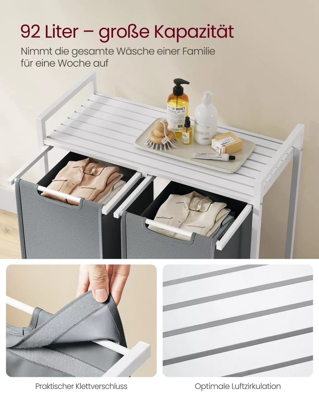 A praktikus kialakítás lehetővé teszi a szennyesek hatékony szétválogatását, miközben a kivehető zsákok megkönnyítik a ruhák mosógépbe helyezését. A letisztult fehér-szürke színkombináció és a kompakt dizájn harmonikusan illeszkedik bármely fürdőszoba vagy mosókonyha berendezéséhez.