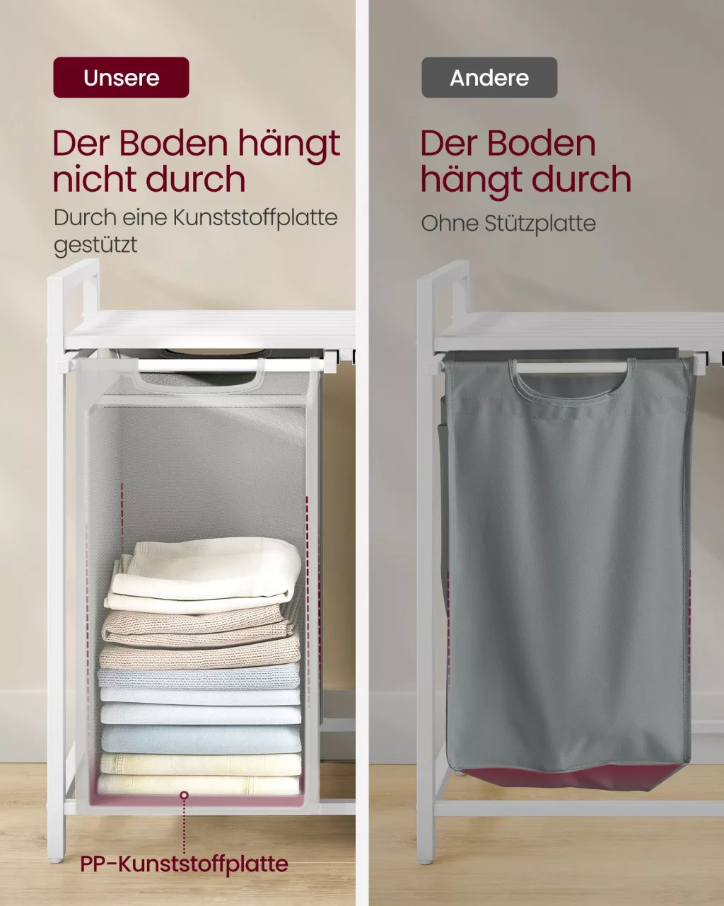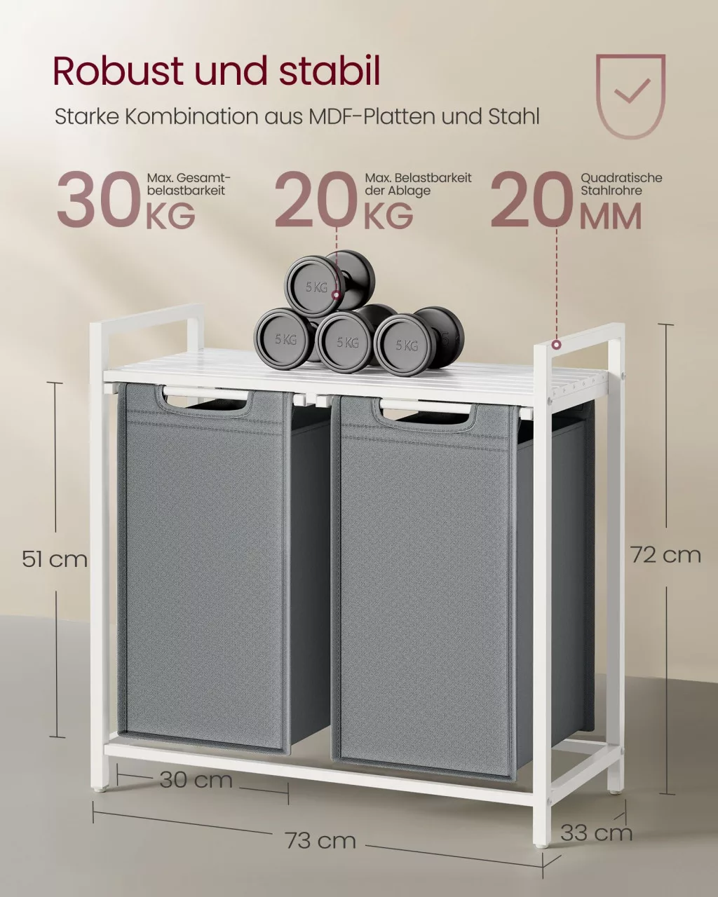 Praktikus, kétrekeszes szennyestartó beépített tárolópolccal, amely tökéletes megoldást nyújt a mosodai rendszerezéshez és extra tárolóhelyhez.