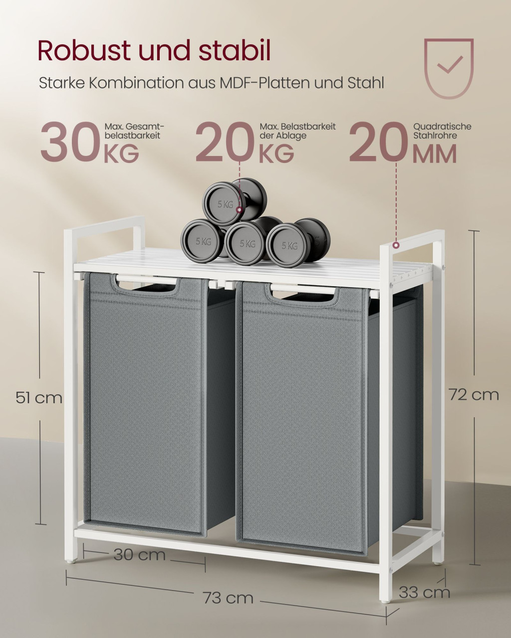 Ez a modern VASAGLE szennyestartó innovatív megoldást kínál a mosodai rendszerezéshez két különálló, nagy kapacitású tárolórekesszel. A stabil fémváz és a minőségi Oxford szövet zsákok biztosítják a tartósságot, míg a felső polc extra tárolóhelyet biztosít mosószeres flakonok és egyéb mosodai kellékek számára.