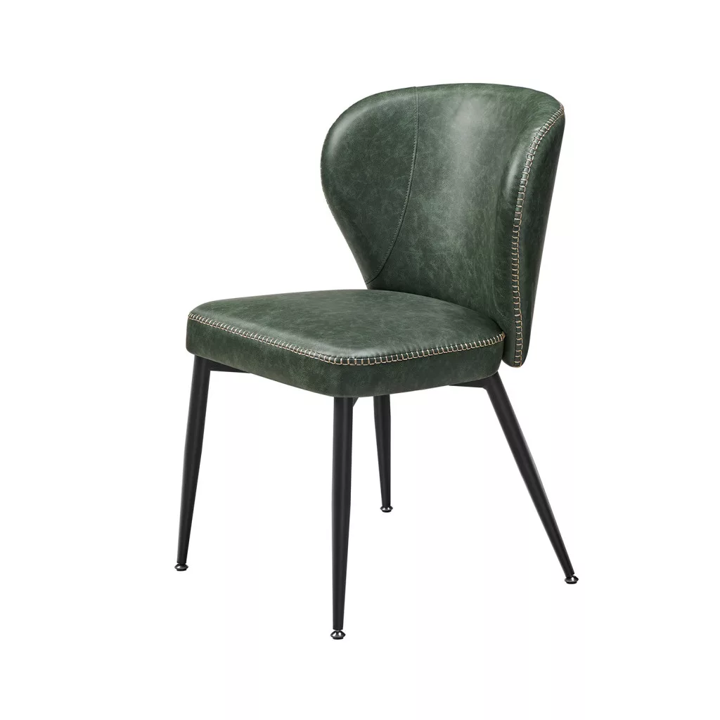 Elegáns, erdőzöld műbőr étkezőszék kényelmes, vastag párnázással és dekoratív varrással, amely tökéletesen ötvözi a modern dizájnt a funkcionalitással.
