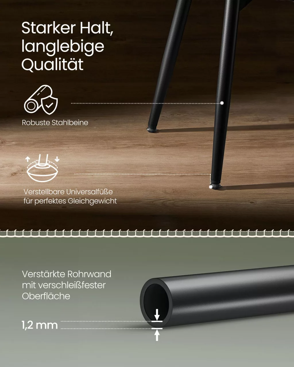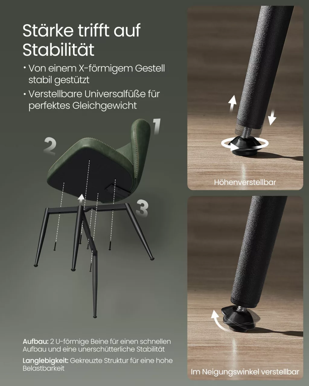 A stabil acél lábszerkezet és az állítható talpak garantálják a biztonságos használatot még egyenetlen padlón is. A könnyen tisztítható műbőr felület praktikus választássá teszi a mindennapi használatra.