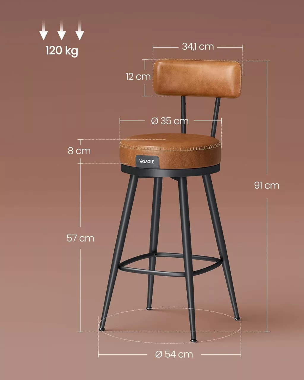 VASAGLE EKHO Forgatható Bárszék Szett, Mid-Century Modern Műbőr Bárszékek Háttámlával, Karamell Barna