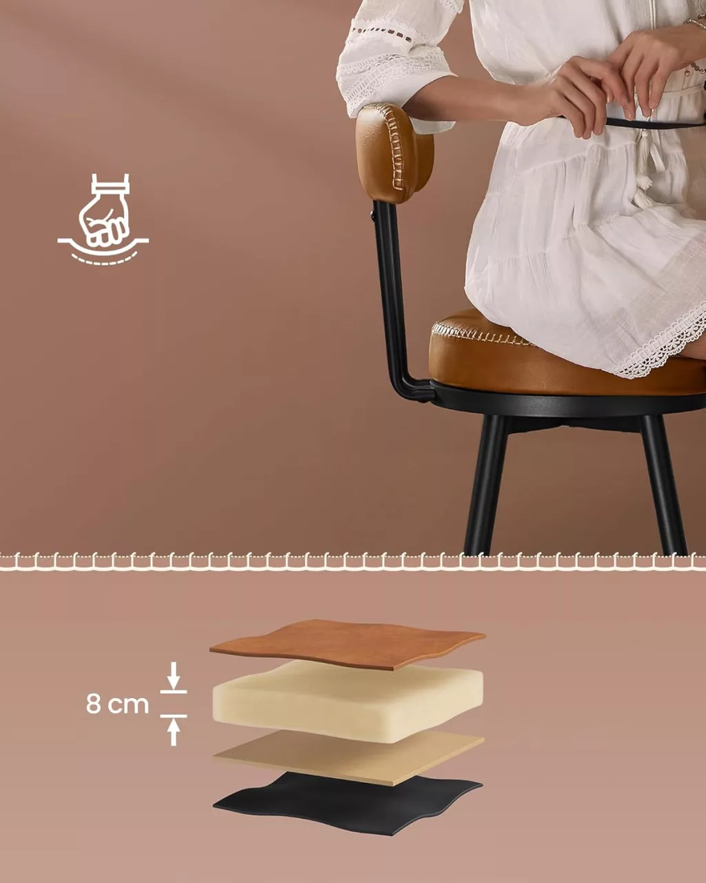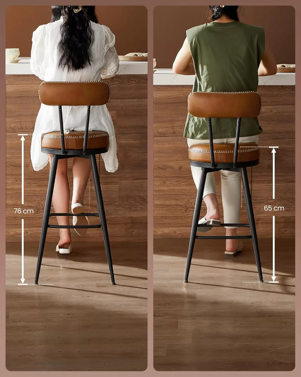 A Bronze A' Design Award 2024 díjjal elismert EKHO bárszékek a mid-century modern dizájn és a praktikus funkcionalitás tökéletes ötvözetét nyújtják. A karamell barna műbőr kárpitozás kifinomult varrással és a 3,1 hüvelyk vastag, 58D formázott habszivacs ülőpárna kivételes kényelmet biztosít.