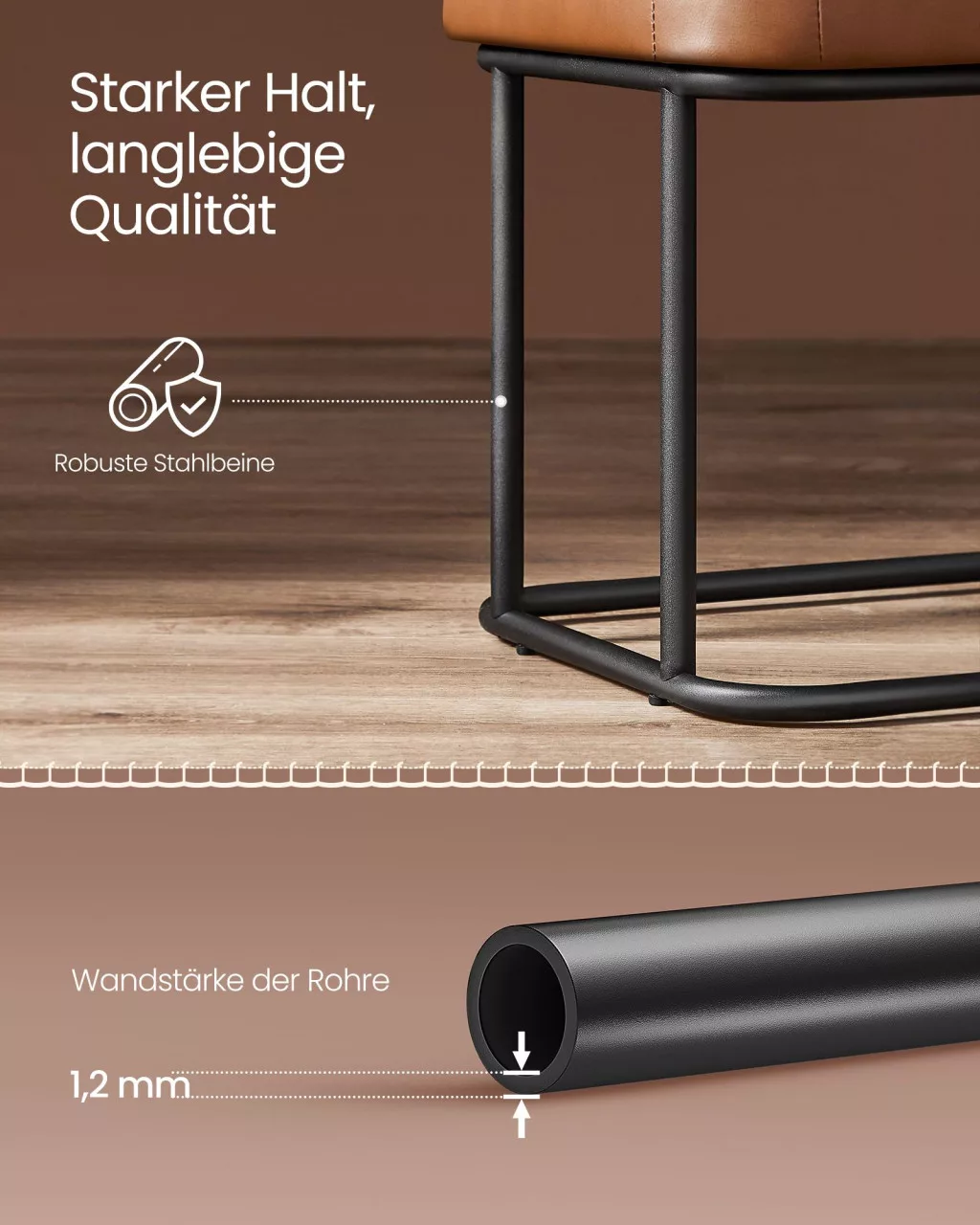 A VASAGLE EKHO kollekció ülőpadja a modern design és praktikum tökéletes ötvözete. A karamellbarna műbőr borítás és a precíz varrások elegáns megjelenést kölcsönöznek, míg a robusztus acélváz biztosítja a tartósságot. A 6 cm vastag, nagy rugalmasságú habszivacs töltet hosszan tartó kényelmet garantál.