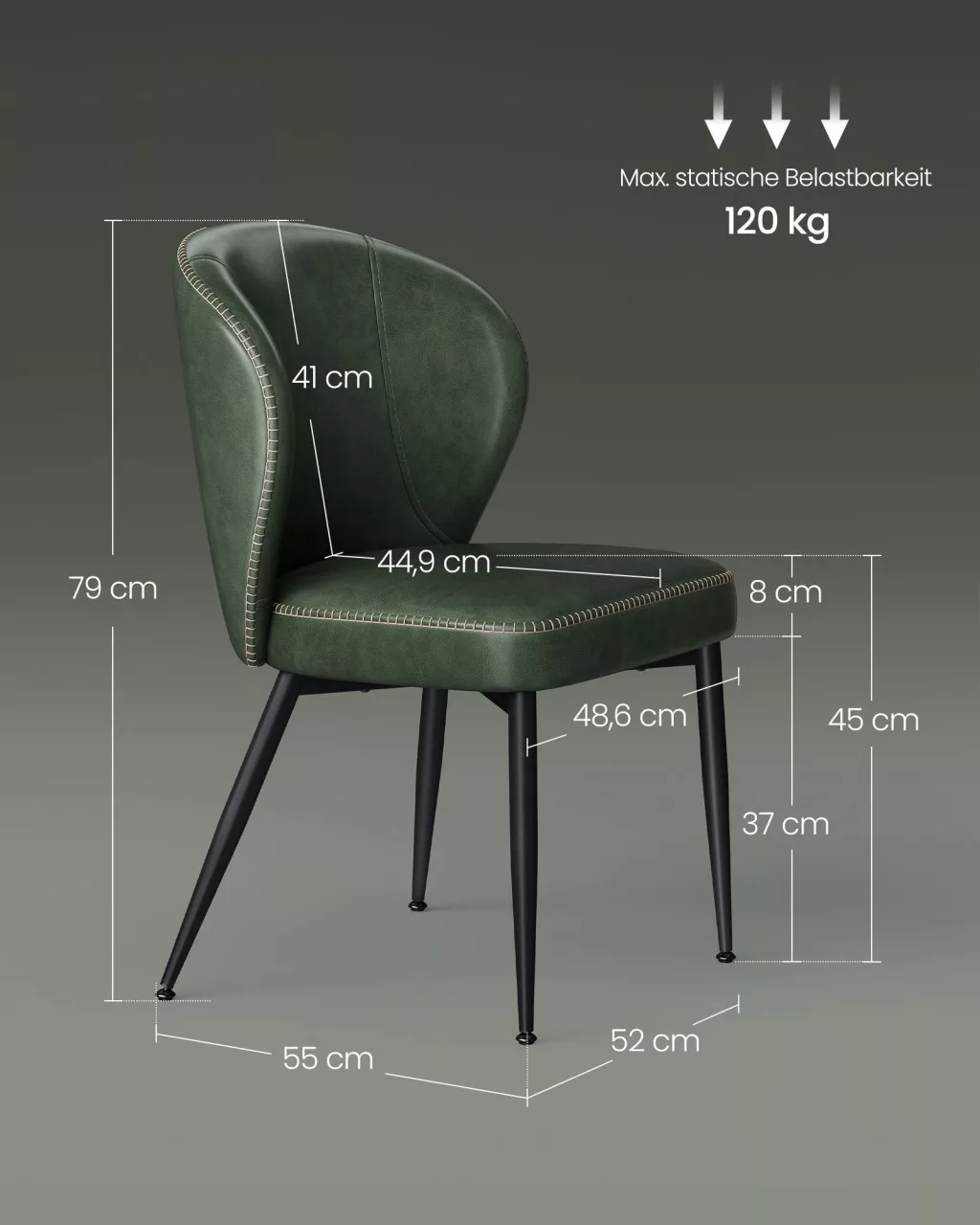 Elegáns, erdőzöld műbőr kárpitozású étkezőszék szett kényelmes, ívelt háttámlával és stabil acél lábakkal, tökéletes választás modern étkező- és nappalikba.