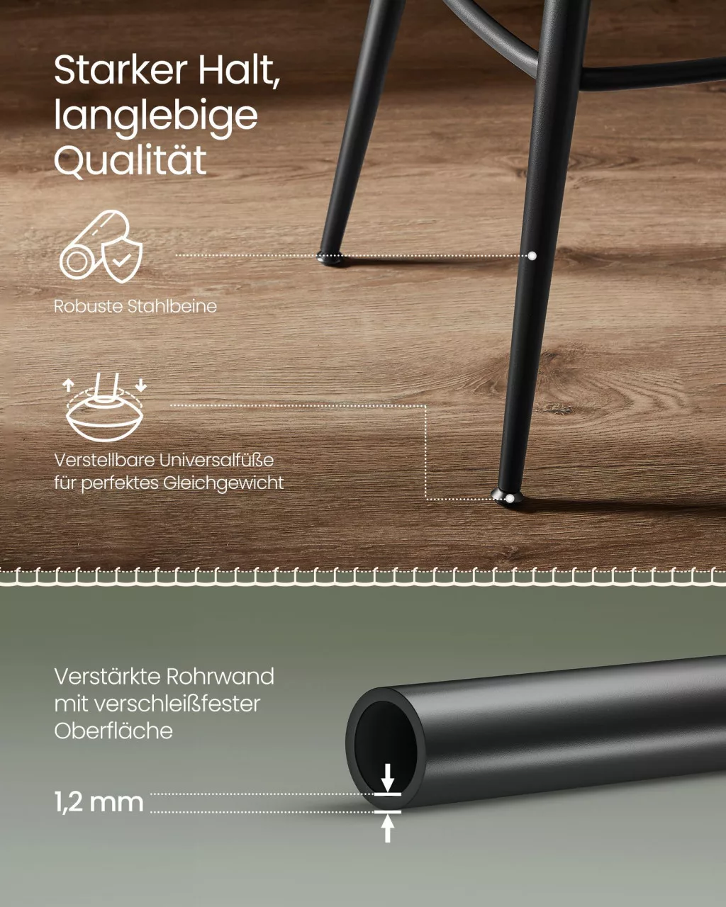 A stabil acél váz és az állítható lábvégek garantálják a biztonságos használatot bármilyen padlófelületen. Két különböző magasságban elérhető, így tökéletesen illeszkedik mind az alacsonyabb (89-94 cm), mind a magasabb (100-110 cm) pultokhoz.
