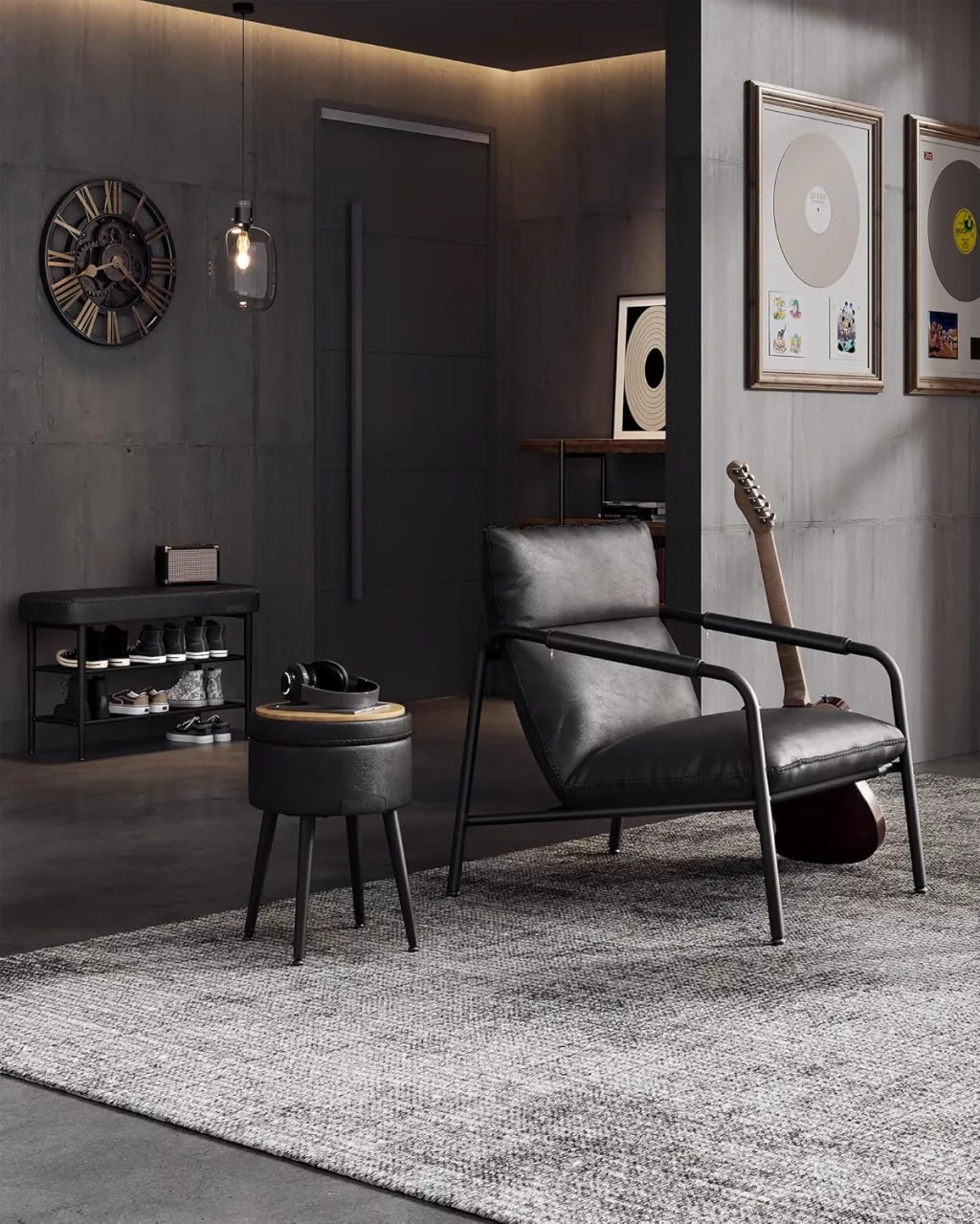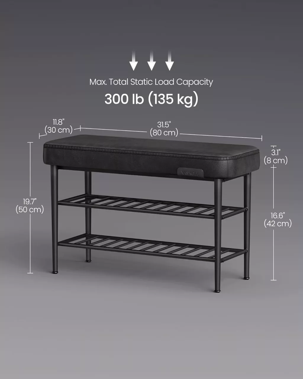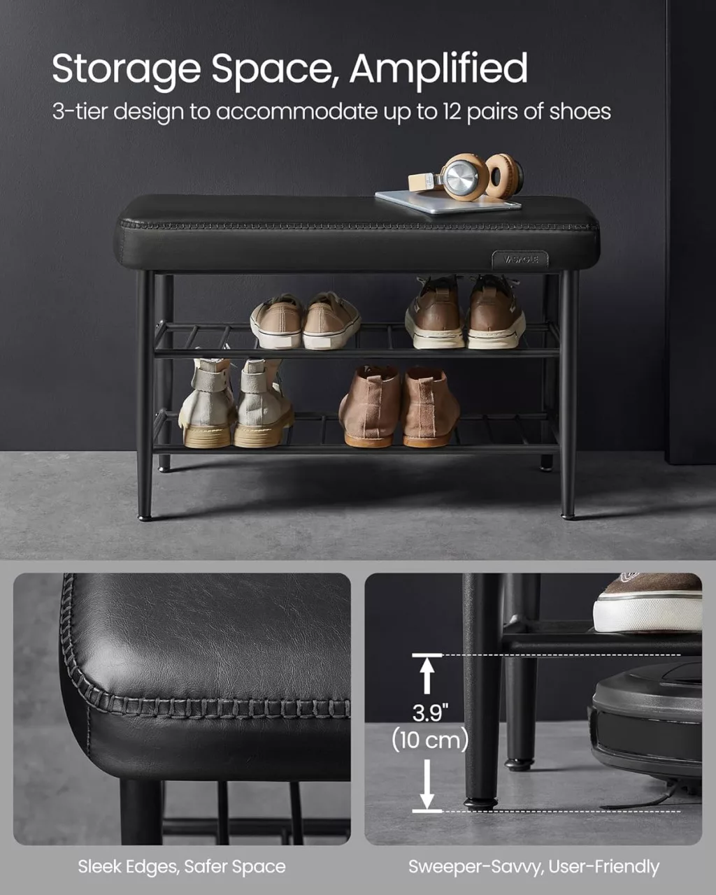 Az erős acél váz és az állítható lábak 135 kg-ig terhelhetőséget garantálnak, míg a háromszintes alsó polc praktikus tárolási lehetőséget kínál cipőinek számára. A 10 cm-es talajmagasság lehetővé teszi, hogy robotporszívója könnyedén tisztítsa a pad alatti területet. A finom varrások és lekerekített kontúrok biztonságosabbá és esztétikusabbá teszik a bútort, amely bármely modern otthonba tökéletesen illeszkedik.
