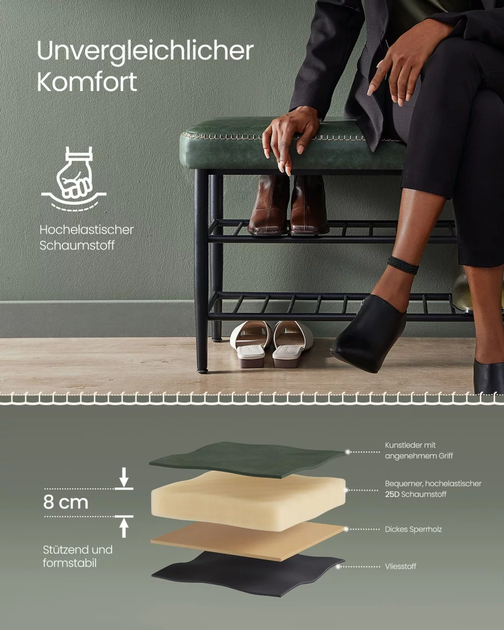 A VASAGLE EKHO kollekcióból származó cipős pad a modern design és a praktikus funkcionalitás tökéletes ötvözete. Az erdőzöld műbőr kárpit finom varrásokkal díszítve a 60-as évek elegáns hangulatát idézi, miközben a robusztus fekete acélváz kortárs stílust kölcsönöz a bútor számára. A 6 cm vastag, 25D sűrűségű rugalmas habszivacs ülőfelület hosszú távon is megőrzi alakját, és kivételes kényelmet biztosít minden használat alkalmával.