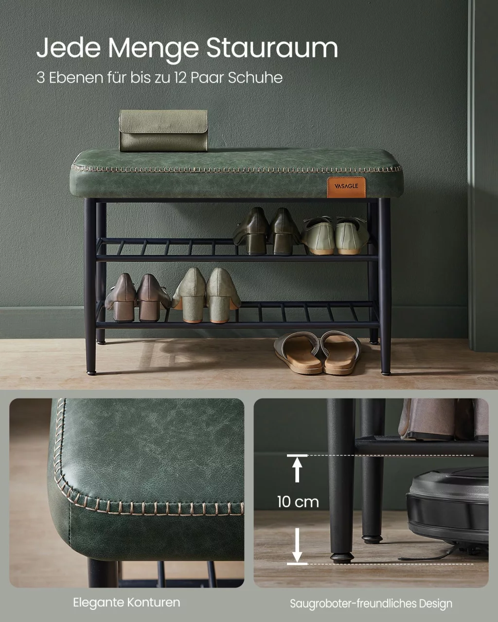 A VASAGLE EKHO kollekcióból származó stílusos cipős pad, amely kényelmes ülőfelületet és praktikus tárolóhelyet kínál az előszobában. A 60-as évek hangulatát idéző erdőzöld műbőr kárpit és a dekoratív varrások modern eleganciát varázsolnak otthonába.