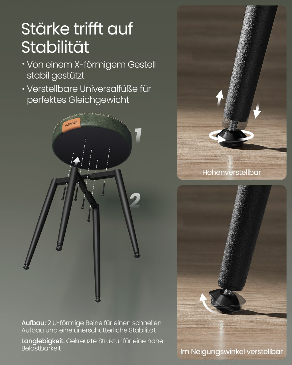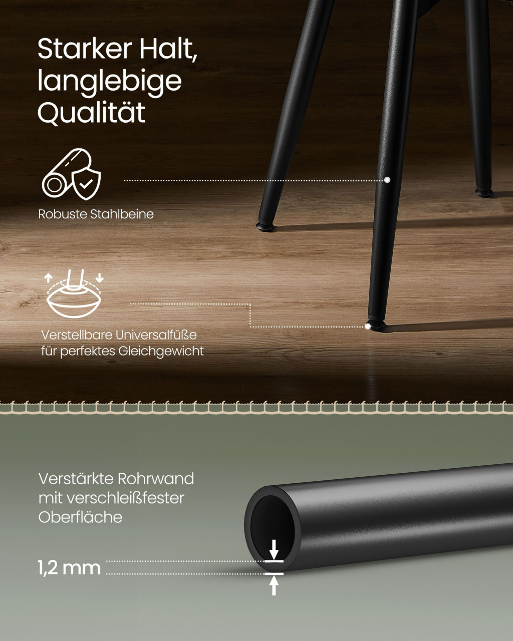 A kifelé álló, fekete fémlábak stabil alapot képeznek, az állítható talpak pedig minden padlótípuson biztonságos használatot tesznek lehetővé. A kompakt méretének köszönhetően kis terekbe is tökéletesen illeszkedik, legyen szó étkezőről, nappalitól vagy dolgozószobáról.