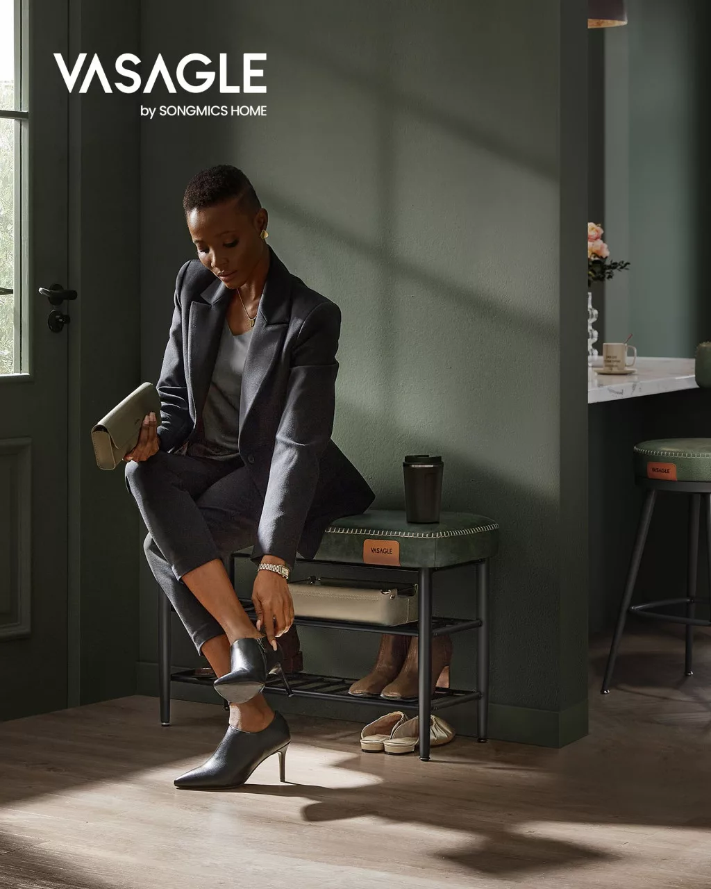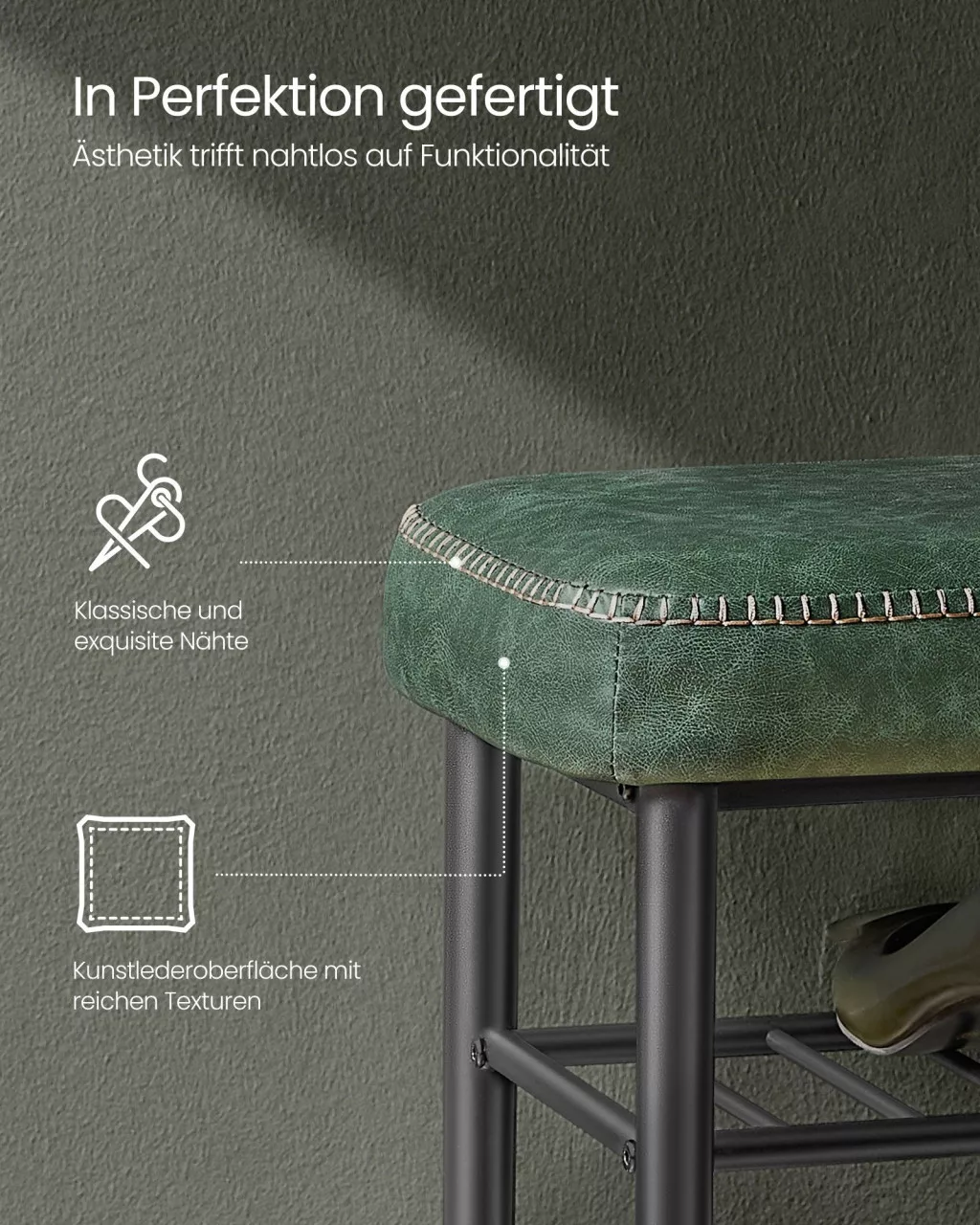 A VASAGLE EKHO kollekció cipőspadja ötvözi a modern dizájnt a praktikussággal. A 6 cm vastag, rugalmas párnázással ellátott ülőfelület maximális kényelmet biztosít, míg az erdőzöld műbőr borítás és a dekoratív varrások elegáns megjelenést kölcsönöznek.