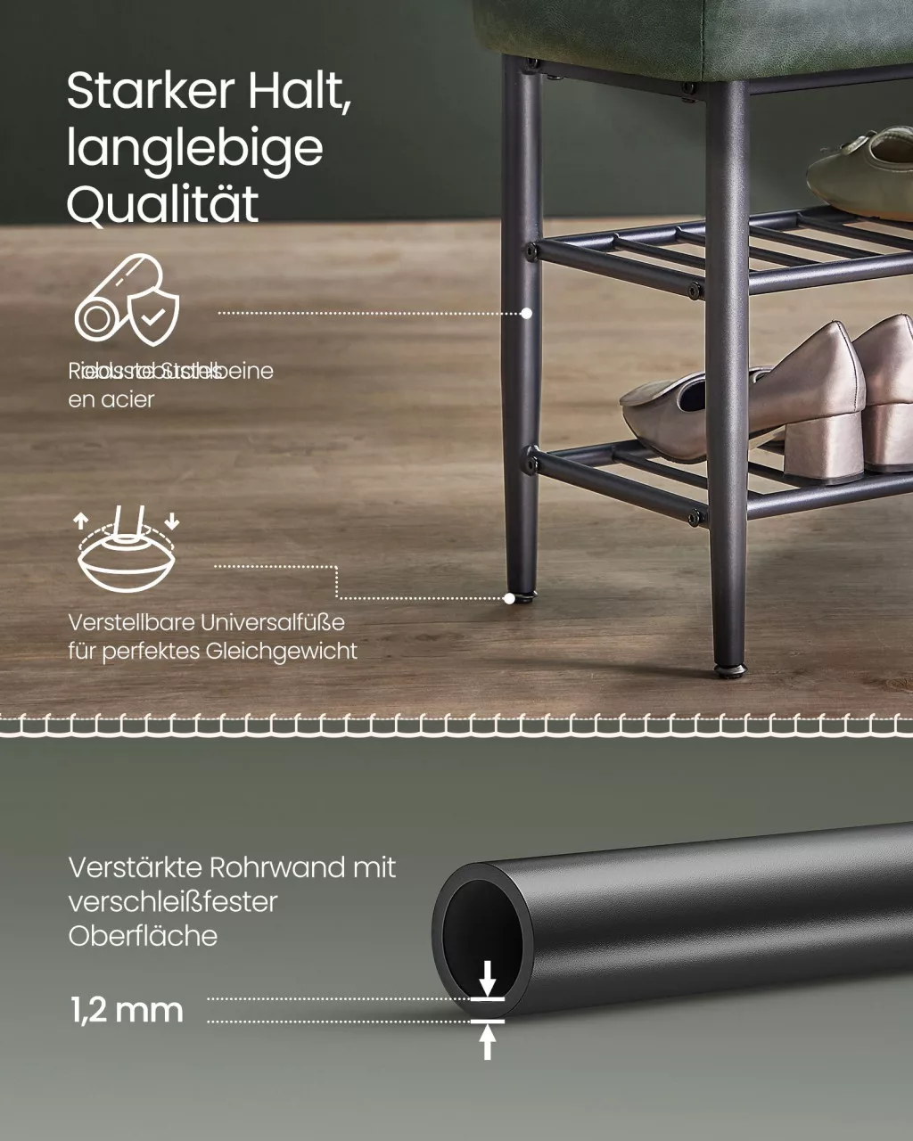 A robusztus acélváz és a két beépített cipőtároló polc maximális funkcionalitást nyújt. A padlótól 10 cm-re elhelyezett alsó polc lehetővé teszi a robotporszívó akadálytalan működését, így a tisztaság fenntartása sem jelent gondot.